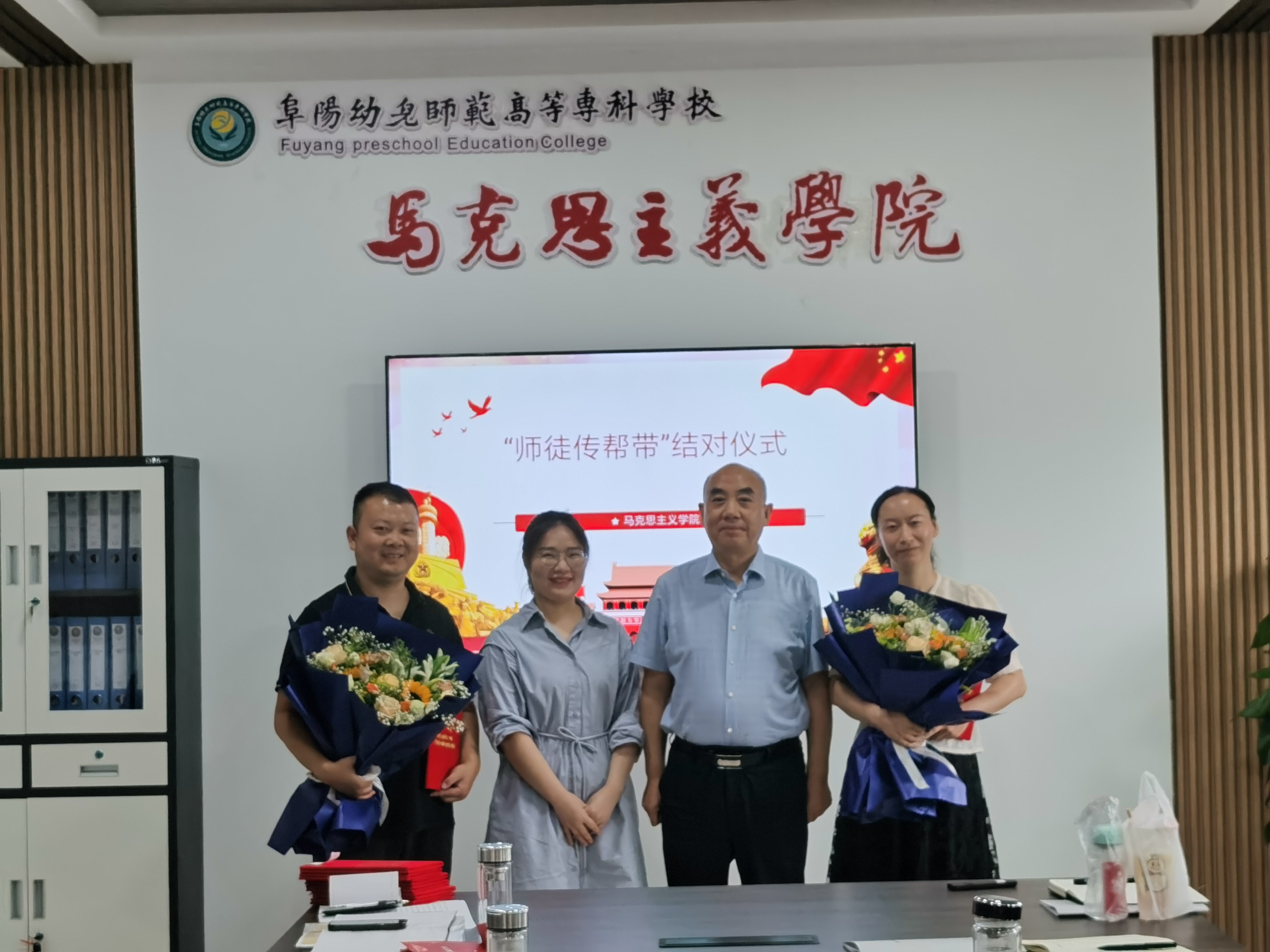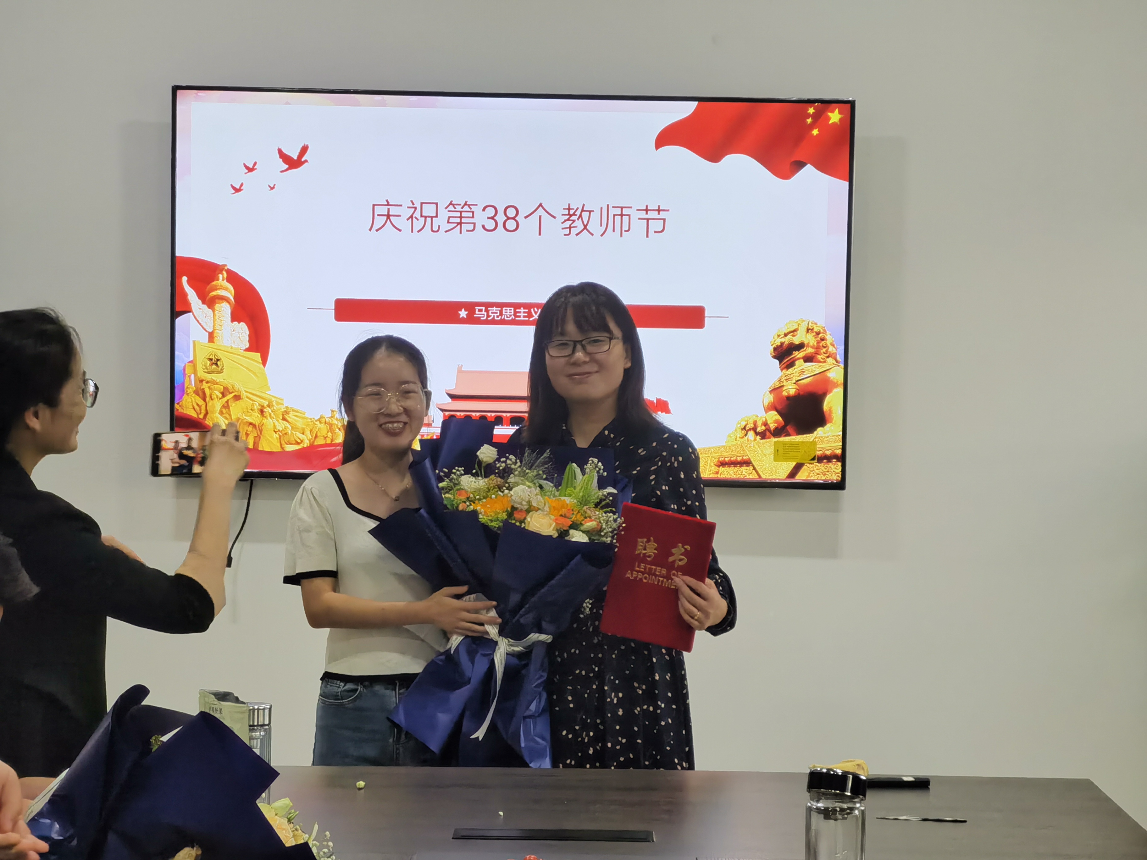 在“师徒传帮带”结对仪式上,于花献向指导老师颁发了聘书,青年教师向指导老师行拜师礼、献花。指导教师代表刘雪作了发言,青年教师代表王丽茹回顾了来马克思主义学院工作以来的点点滴滴,感恩在与大家的相聚,感恩老教师的指导,表达了对未来工作的期许与热忱。