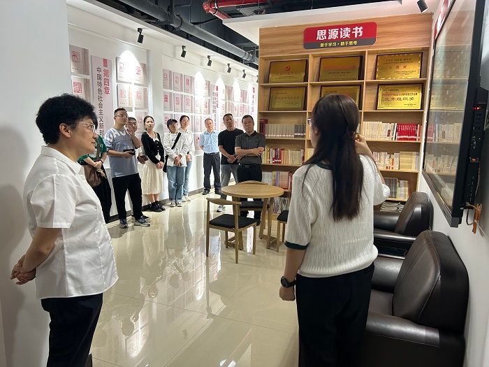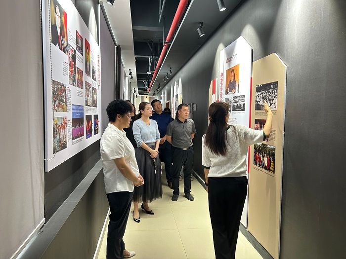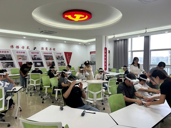 吴静一行参观了百年党史文化长廊、影音学习角、印说党史、思源读书角、红色影院、中国共产党人精神谱系及智慧教室等,并穿戴VR设备体验了“王家坝抗洪救援”“红军爬雪山”“飞夺泸定桥”等虚拟仿真思政实训课程。