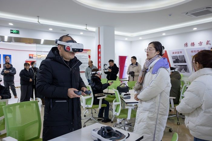 林业局一行先后参观了红色影院、观摩了AR魔屏、参与了初心问答,并体验了VR“王家坝抗洪救援”“红军爬雪山”“平型关大捷”等虚拟仿真思政课程。参观体验完后,他们对我院利用虚拟仿真实训资源优势,打造线上线下混合式思政实践教学课程的教学模式赞不绝口。