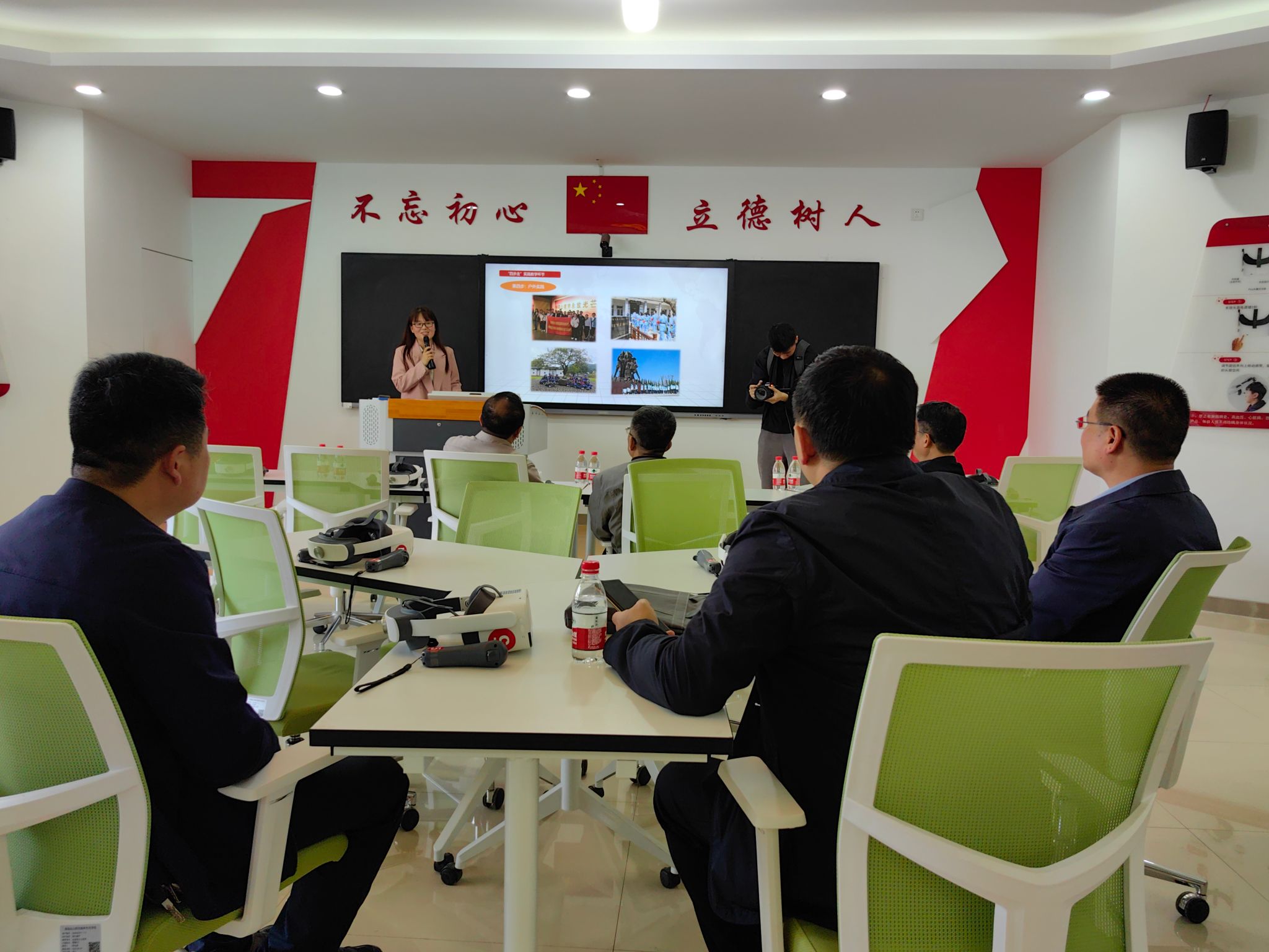 马克思主义学院教师王文英为一行人员介绍了我校虚拟仿真思政课体验教学中心的总体情况,重点汇报了中心利用虚拟仿真技术开展“四步走”实践教学,打造沉浸式、体验式思政教学模式, 在社会科学普及工作方面的经验和特色。