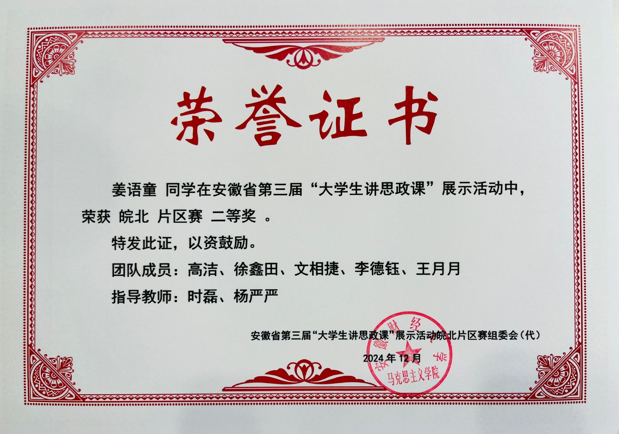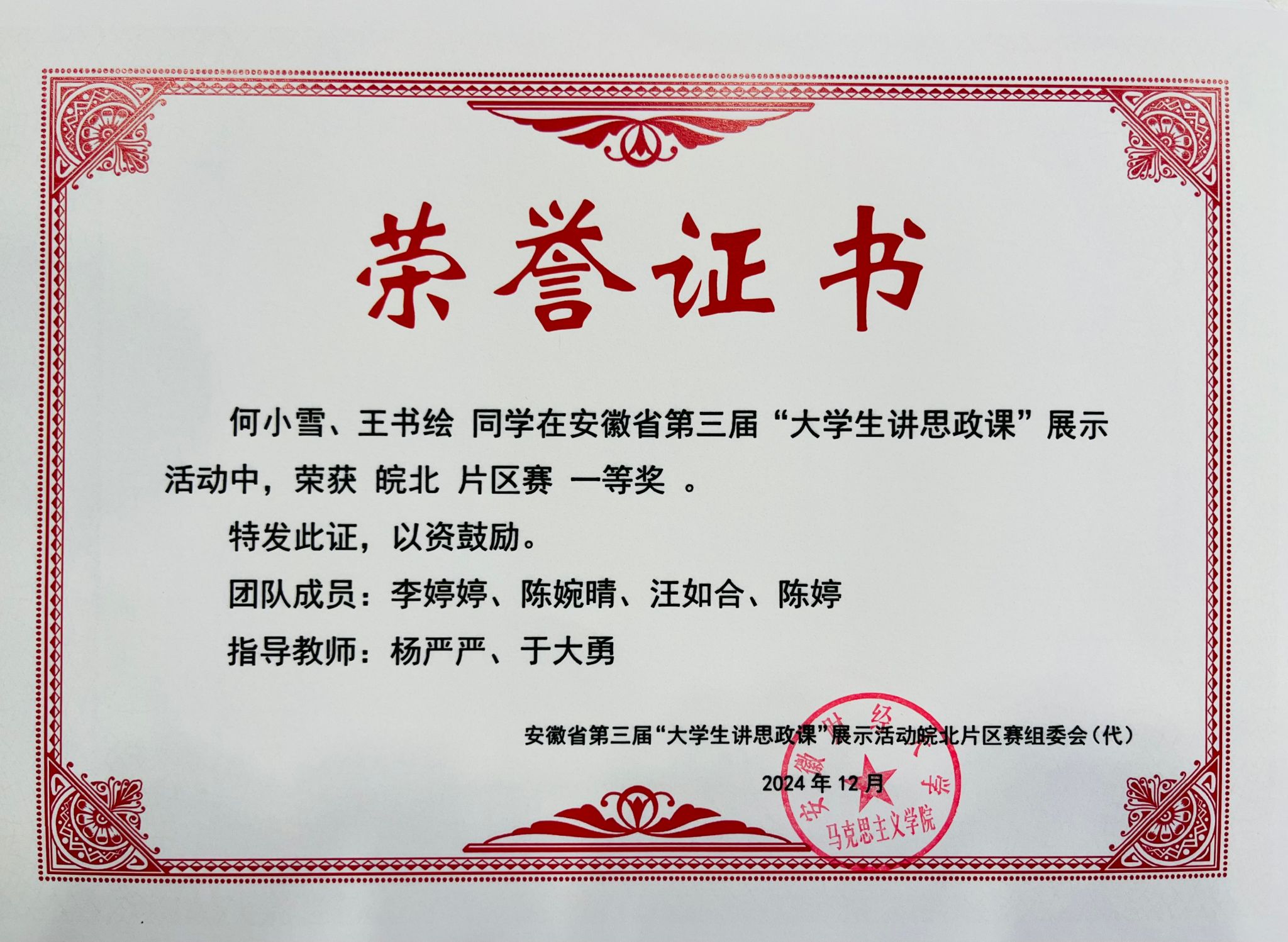 学院对本次比赛高度重视,结合往届比赛情况,提前半年时间开始组织学院选拔比赛,提前备赛打磨,效果很好,结果有了质的突破。经校级初赛推荐、片区赛评审,马克思主义学院杨严严、于大勇两位老师指导的学生何小雪、王书绘等荣获皖北片区赛一等奖;时磊、杨严严两位老师指导的学生姜语童等荣获皖北片区赛二等奖;刘雪、时磊两位老师指导的学生时玉洁等荣获皖北片区赛三等奖。其中,何小雪、王书绘等两组同学将代表学校参加省级决赛。