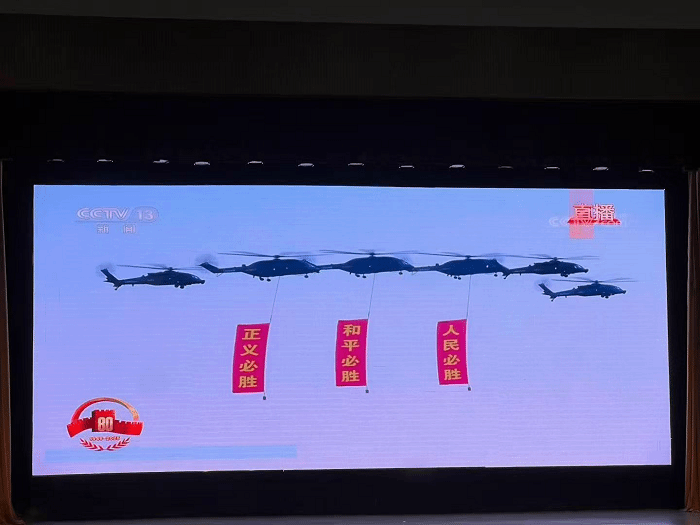 观看过程中,全体教师全神贯注,心情随着阅兵式的推进而激动不已。看到受阅官兵威武雄壮的英姿和新型武器装备的先进强大,民族自豪感油然而生,为祖国今日之强大感到无比骄傲。