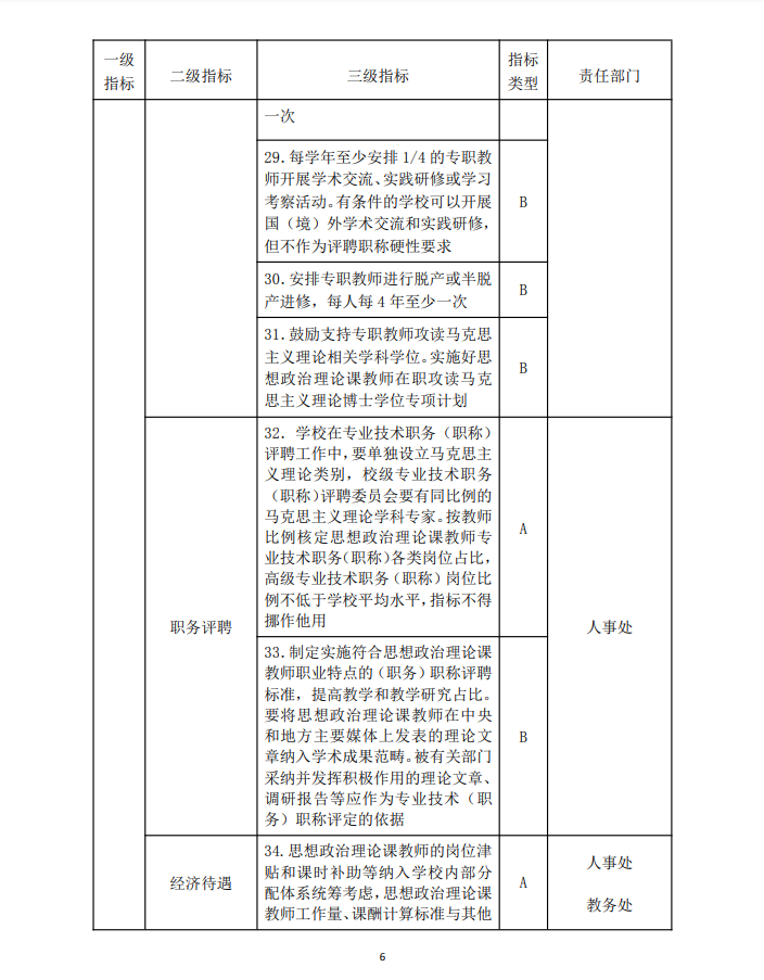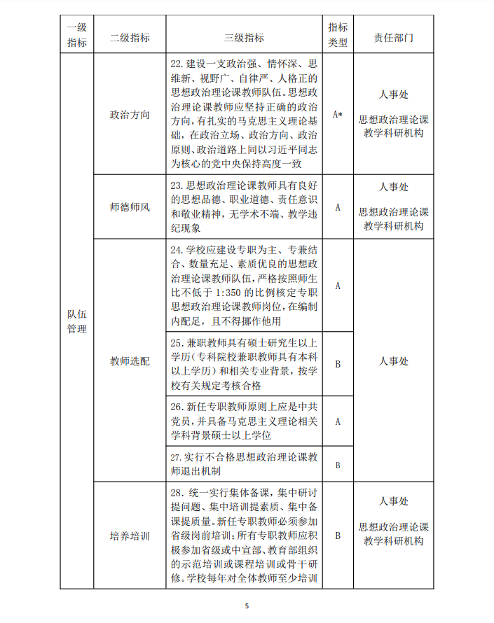 教师队伍建设 | 政治素质 | 31.按照政治要强、情怀要深、思维要新、视野要广、自律要严、人格要正的要求,建设一支专职为主、专兼结合、数量充足、素质优良的思政课教师队伍 | A |