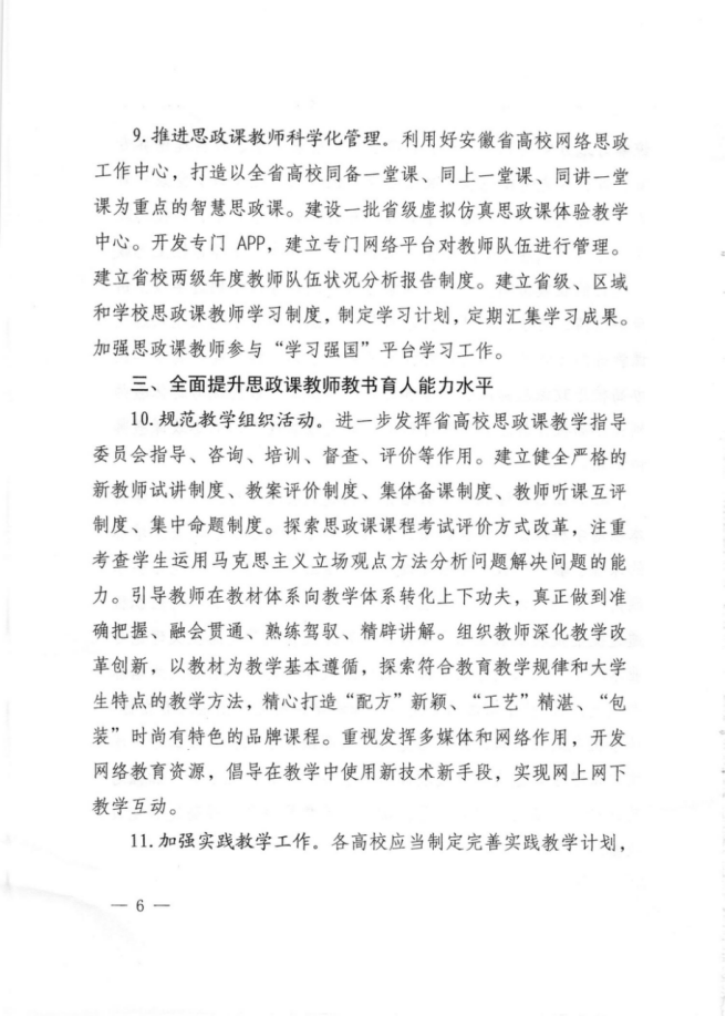 4.建立“传帮带”工作机制,通过培训、访学、教学比赛等多种方式,切实提高教师教学能力。探索思想政治理论课教师队伍与日常思想政治教育教师队伍深度融合的工作机制。 |