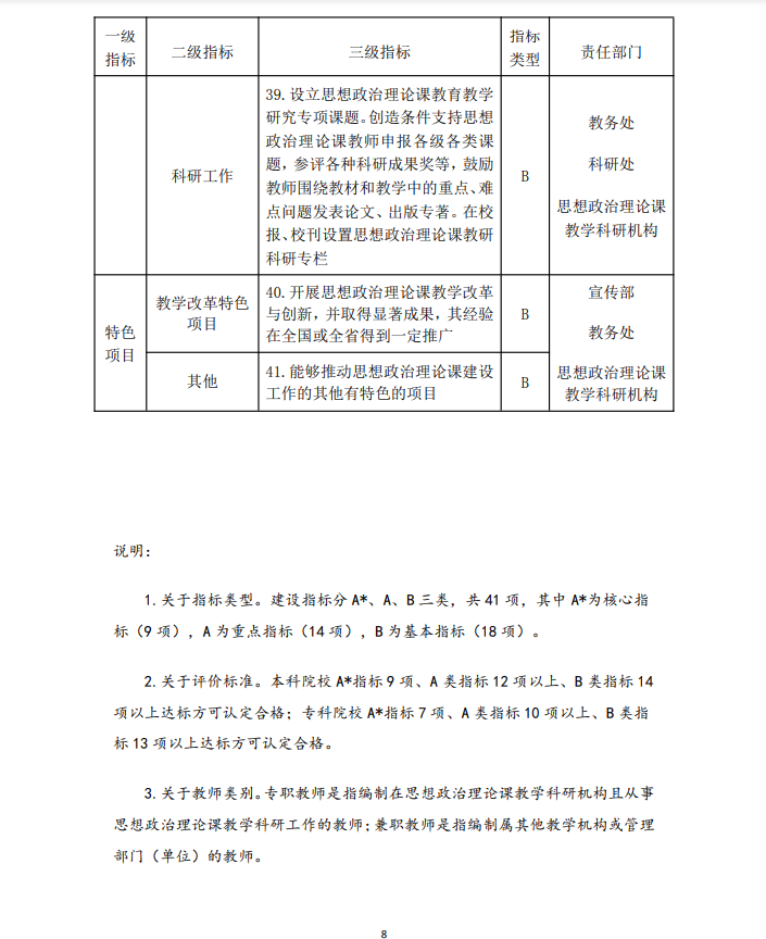 8.严格督导考核,在巡视巡察中加大对马克思主义学院建设情况的督查力度。把马克思主义学院建设列为学校党的建设工作考核、办学质量评估的重要内容,作为学校党政领导班子、主要领导和分管领导综合考核评价的重要参考 | A |
