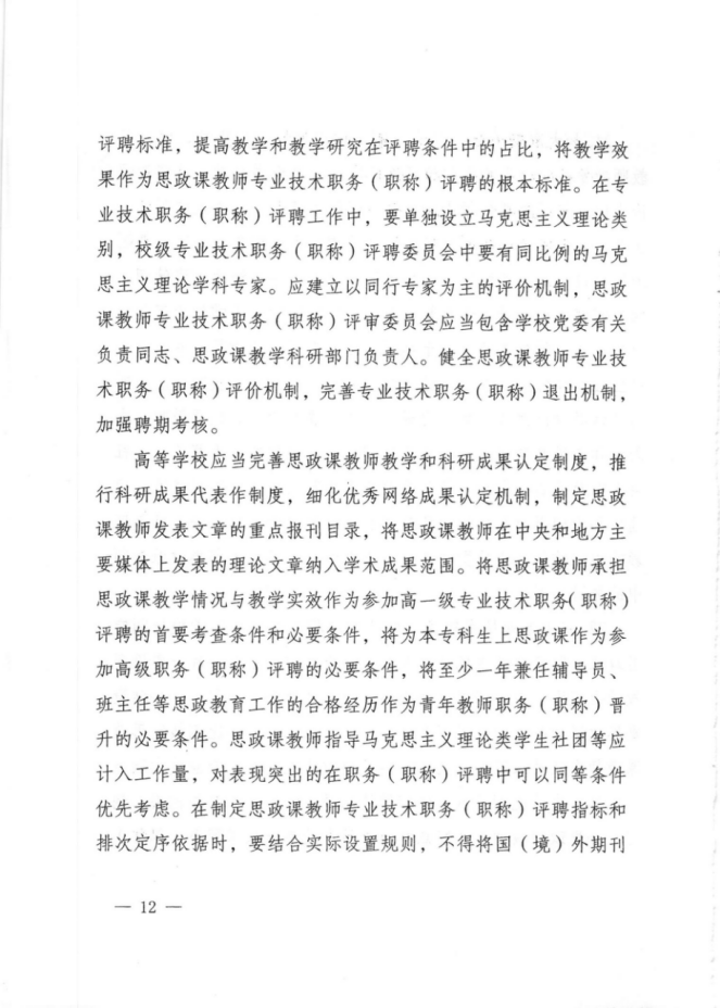 40.制定实施符合思政课教师职业特点的职务(职称)评聘标准,突出教学和教学研究占比。思政课教师参加中央和国家机关举办的教学类活动所获奖项,参与省部级以上重要工作的鉴定证明,在中央主流媒体、地方主要党报党刊发表的理论文章,在中央和国家机关主管的马克思主义理论类学术期刊发表的论文成果,被省部级以上部门采纳的决策咨询报告,产生重要影响的网络优秀作品等,应作为专业技术职务(职称)评定的核心成果 | A* |