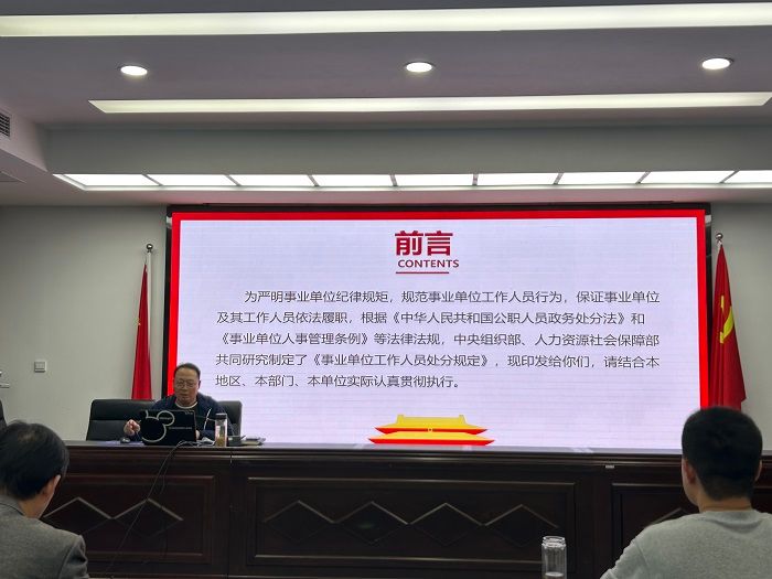 随后,机关党总支邀请校纪委副书记、监察室主任郑长胜进行专题讲座,对《事业单位工作人员处分规定》进行深入剖析和解读,为进一步严明事业单位纪律规矩、规范事业单位工作人员行为,让全体党员干部真正做到学纪、知纪、明纪、守纪,营造风清气正工作环境打下坚实基础。