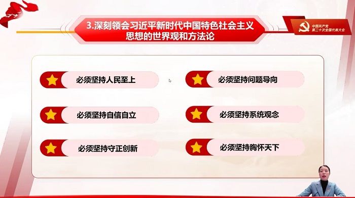 2022年12月14日下午,省级师生巡讲团成员、我校马克思主义学院院长何丽娜作党的二十大精神宣讲报告。学校宣讲团成员、马克思主义学院全体党员通过网络听取了宣讲报告。