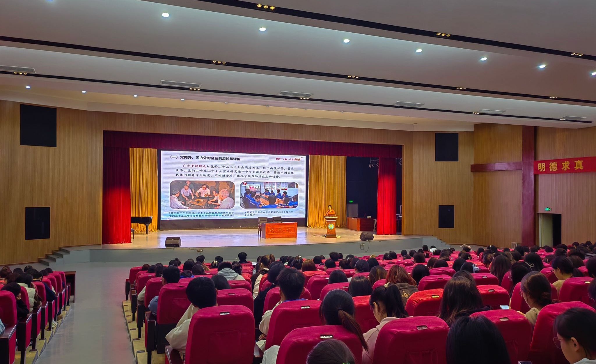 11月7日由校团委组织,宣讲团第二小组德馨楼演艺大厅,面向全校主要学生干部,围绕党的二十届三中全会精神进行宣讲。专题一校团委王资颖老师围绕深刻学习领会党的二十届三中全会的重大意义进行宣讲,内容丰富且引人入胜专题二由马克思主义学院李支援老师围绕抓住深化经济体制改革“牛鼻子”进行精彩宣讲;专题三由学前教育学院辅导员曹齐老师围绕在民主法治道路上砥砺前行进行宣讲,精彩的举例吸引了同学们的关注;专题四由马克思主义学院徐中圆老师围绕满足人民对美好生活新期待进行宣讲,宣讲要点娓娓道来;专题五由校团委于静老师围绕党的二十届三中全会的贯彻落实进行宣讲。通过详细的解读和生动的案例,使同学们对党的二十届三中全会的贯彻落实有了更深入的理解。