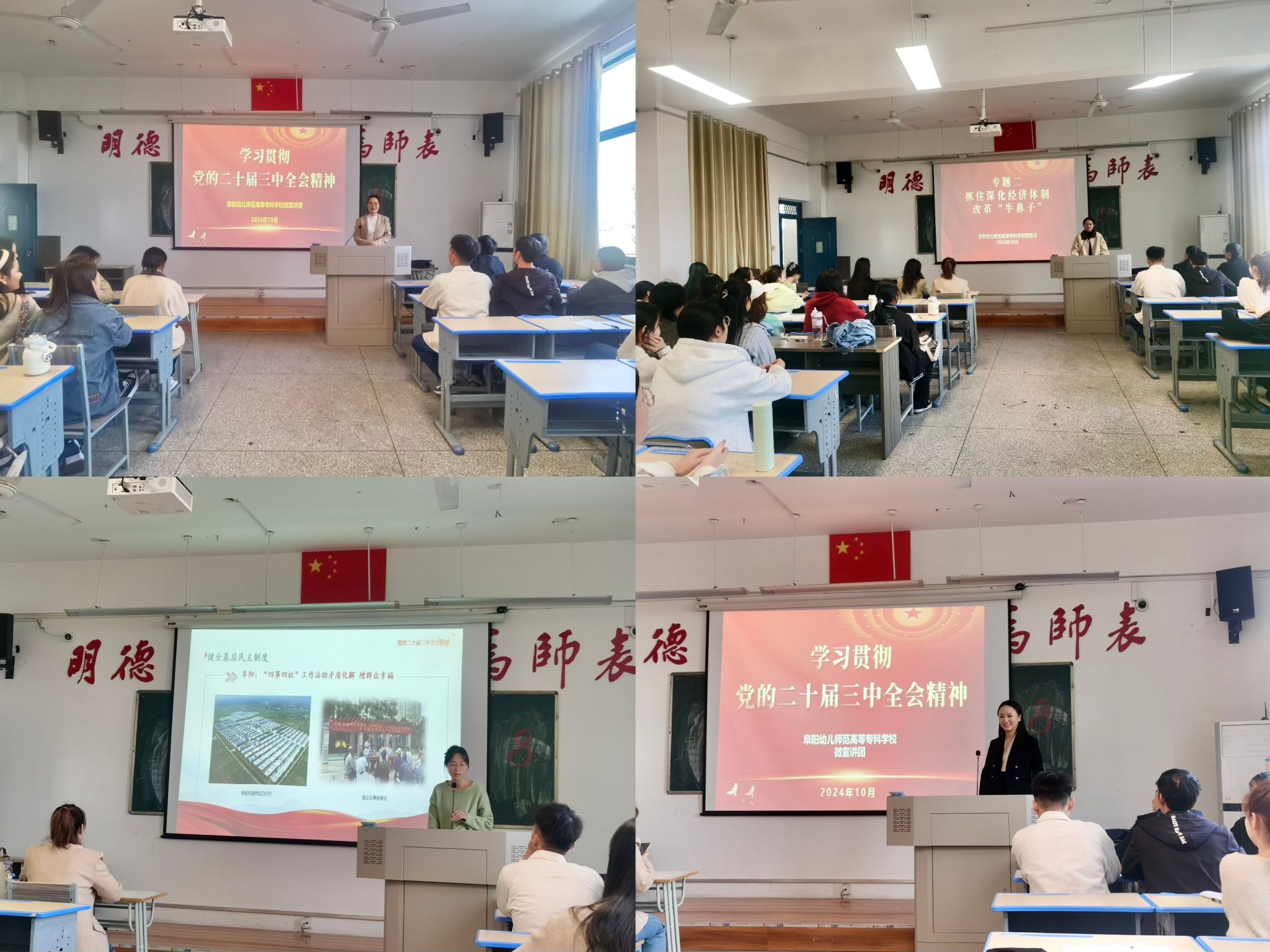 10月25日下午,宣讲走进学前教育学院开展宣讲活动。第一宣讲成员面向学前教育学院全体师生,深入浅出地阐述了党的二十届三中全会的重要内容结合安徽阜阳发展现状、结合学校教学管理实际、依据个人经历及学生成长情况,对全会精神进行阐释讲解。宣讲组成员强调了进一步全面深化改革的重要性,并鼓励学生们将全会精神与日常学习生活相结合,积极投身于实践。