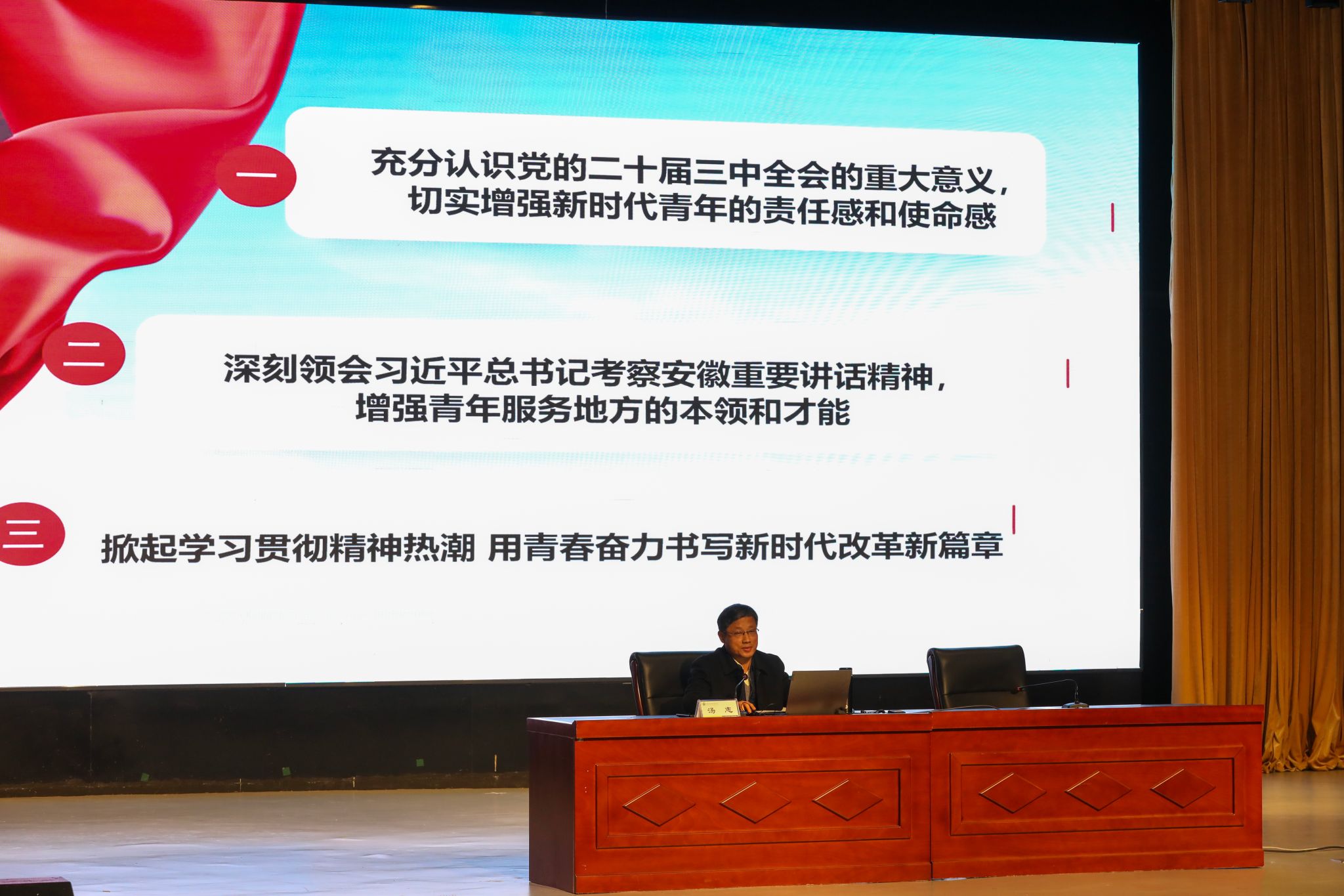 汤志的宣讲报告,围绕充分认识党的二十届三中全会的重大意义,切实增强新时代青年的责任感和使命感;深刻领会习近平总书记考察安徽重要讲话精神,增强青年服务地方的本领和才能;掀起学习贯彻精神热潮,用青春奋力书写新时代改革新篇章等三个方面展开