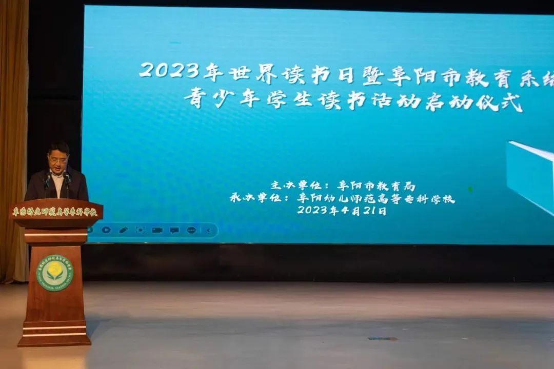 4月21日上午,在第28个世界读书日来临之际,阜阳市青少年学生读书活动启动仪式在我校举行。校党委副书记、校长汤志,市委教育工委书记、市教育局局长齐明砾出席启动仪式。校党委委员、副校长陈绪龙在会议分享学校书香校园建设案例,校党委委员、办公室主任徐常恺出席活动。各县市区教育局及各市直学校相关负责同志,阜城中小学校长、学生代表500余人参加启动仪式。启动仪式由市委教育工委委员、市教育局副局长于乾坤主持。