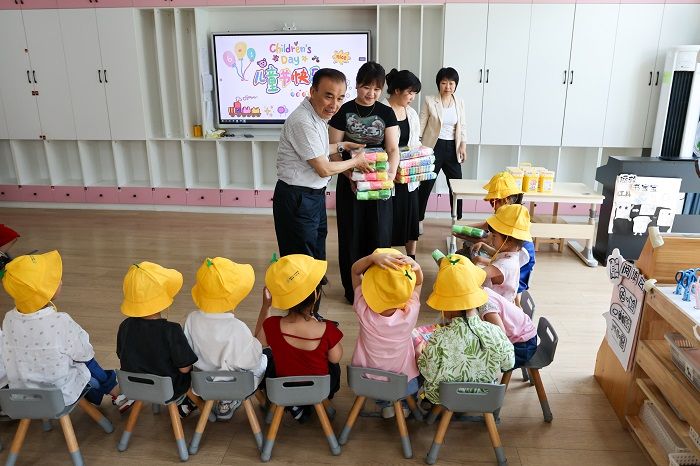 董志诚一行来到教室,与孩子们亲切交流,并为他们送上节日祝福和礼物,祝孩子们快乐生活、茁壮成长。随后,详细查看了幼儿园的基础设施、园所文化、师资配备、教学管理等情况,对幼儿园当前的工作和取得的成绩给予肯定。