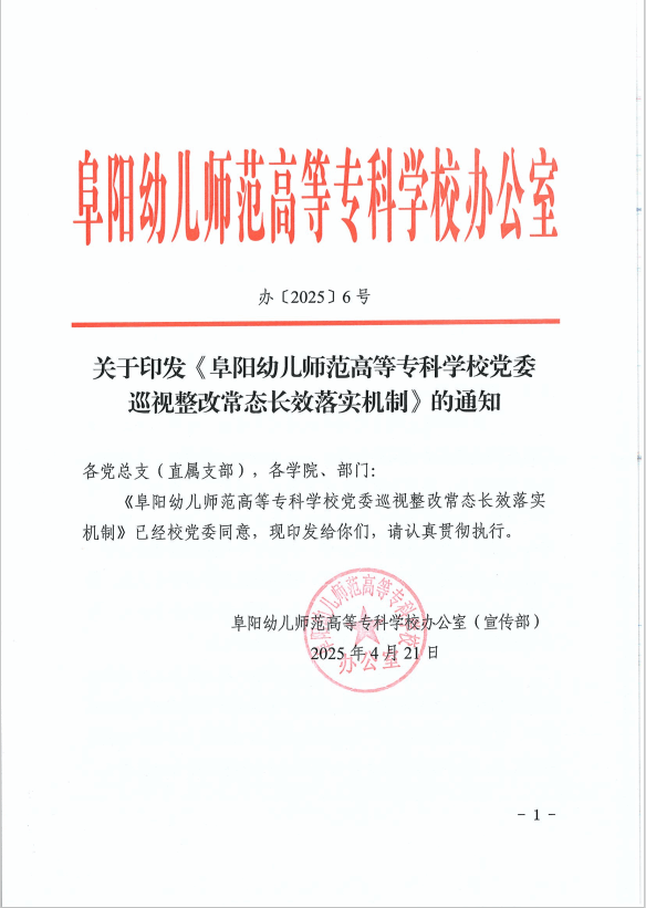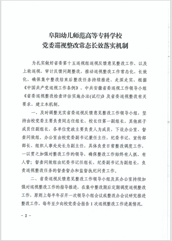 关于印发《阜阳幼儿师范高等专科学校党委巡视整改常态长效落实机制》的通知