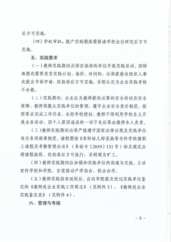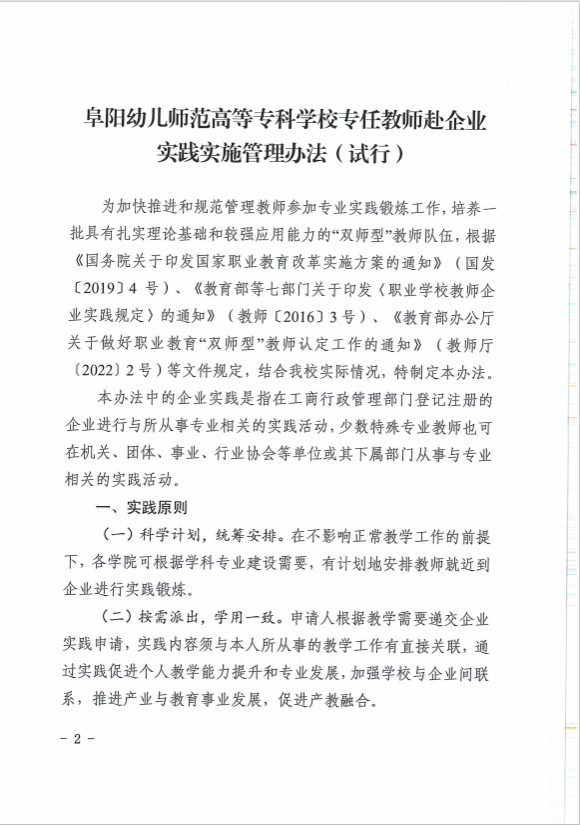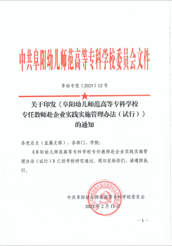 关于印发《阜阳幼儿师范高等专科学校专任教师赴企业实践实施管理办法(试行)》的通知