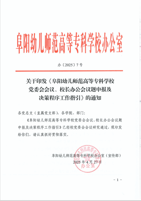 关于印发《阜阳幼儿师范高等专科学校党委会会议、校长办公会议题申报及决策程序工作指引》的通知