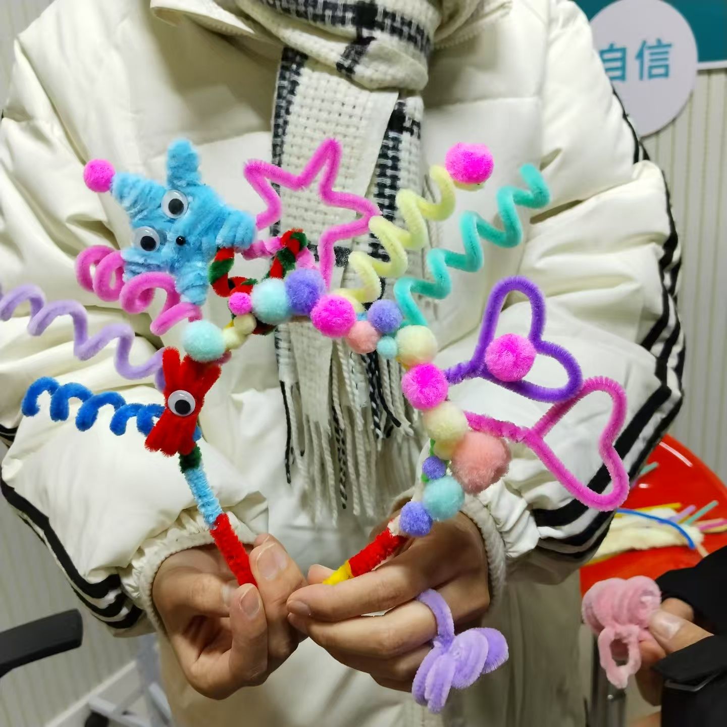 活动开始,工作人员分发扭扭棒、剪刀、胶水等的手工材料。同学们积极参与,热情与喜悦让扭扭棒手工活动变得热闹,同学们创意满满,制作各类小手工,鲜活地展现阜幼学子活泼开朗、独出心裁的精神面貌,同时享受扭扭棒手工制作带来的乐趣。