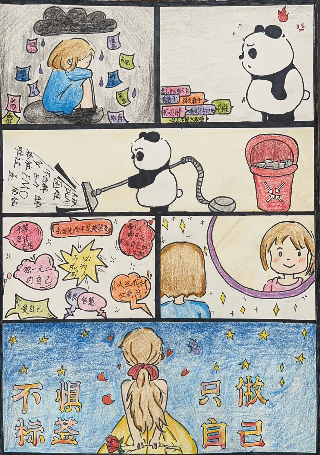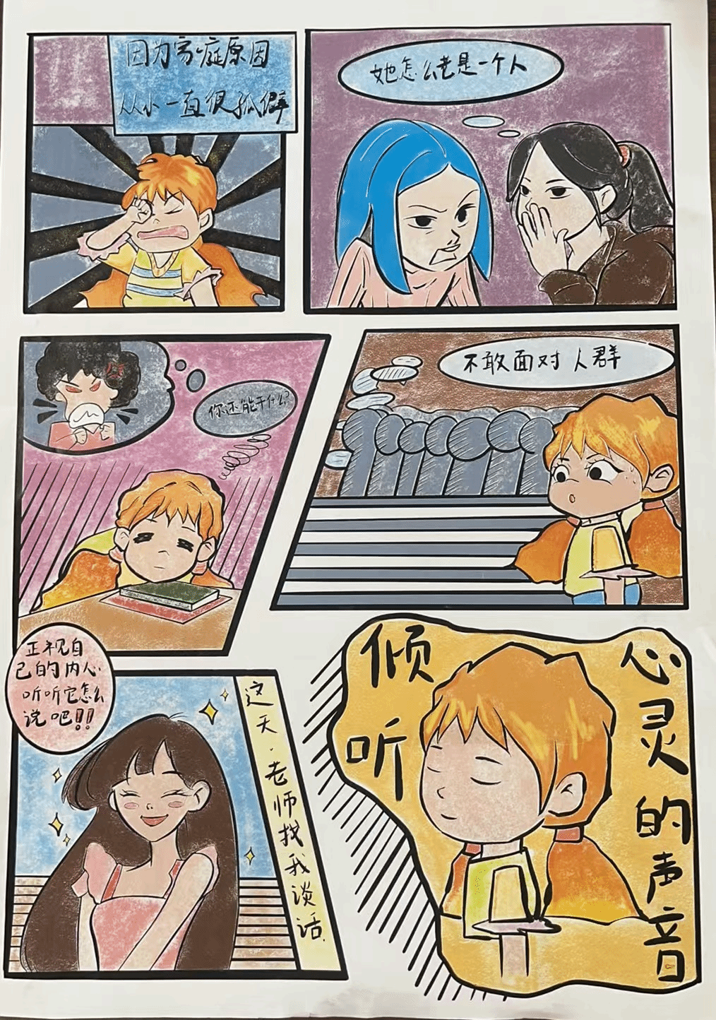 通过心理漫画创作,可促使学生利用漫画的形式,将内心那些或复杂、或隐秘的情绪尽情地抒发出来,进而实现自我认识,清晰地察觉到自身情绪根源以及心理状态;帮助自身调解情绪,让负面情绪得到宣泄,同时强化积极的心理暗示。