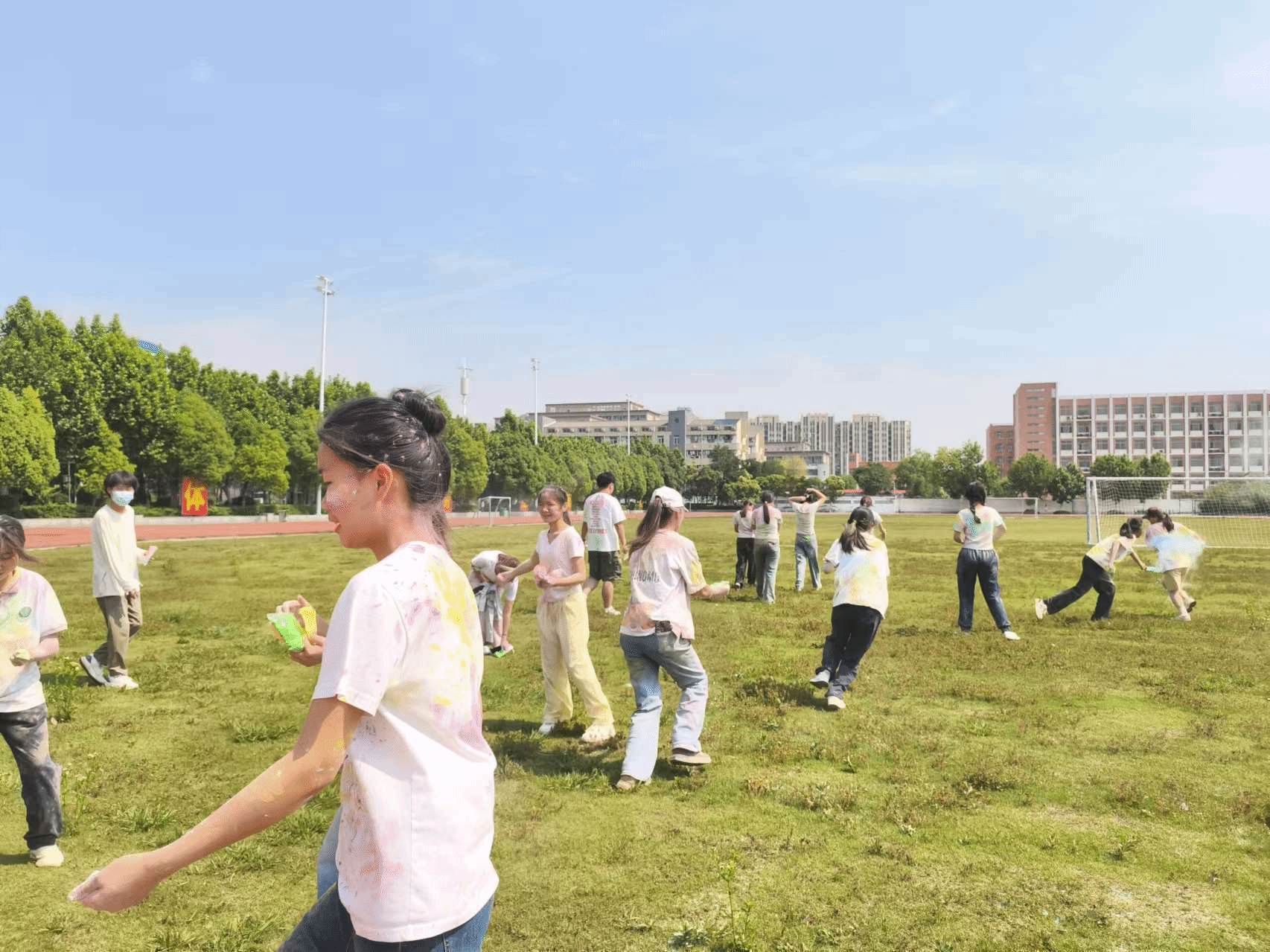 活动以"5·25"心理健康日为契机,将心理健康教育与青春运动深度融合。参与者身着浅色T恤,手持五彩玉米粉,从起点南门出发,沿校园主干道完成趣味跑,同学们在奔跑中抛洒彩粉、互动击掌,用缤纷色彩表达情绪,释放压力。