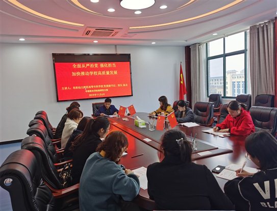 为推动“不忘初心、牢记使命”主题教育活动深入开展,加强广大党员教师的理论修养,2019年11月6日,学校党委副书记、校长汤志为学前教育学院教师支部全体党员上了一堂以“全面从严治党、强化担当,加快推动学校高质量发展”为主题的党课,本次党课在文津楼608会议室进行,由学前教育学院教师支部书记、学前教育学院院长钱友莲主持,学前教育学院教师支部全体党员参加了本次党课学习。
