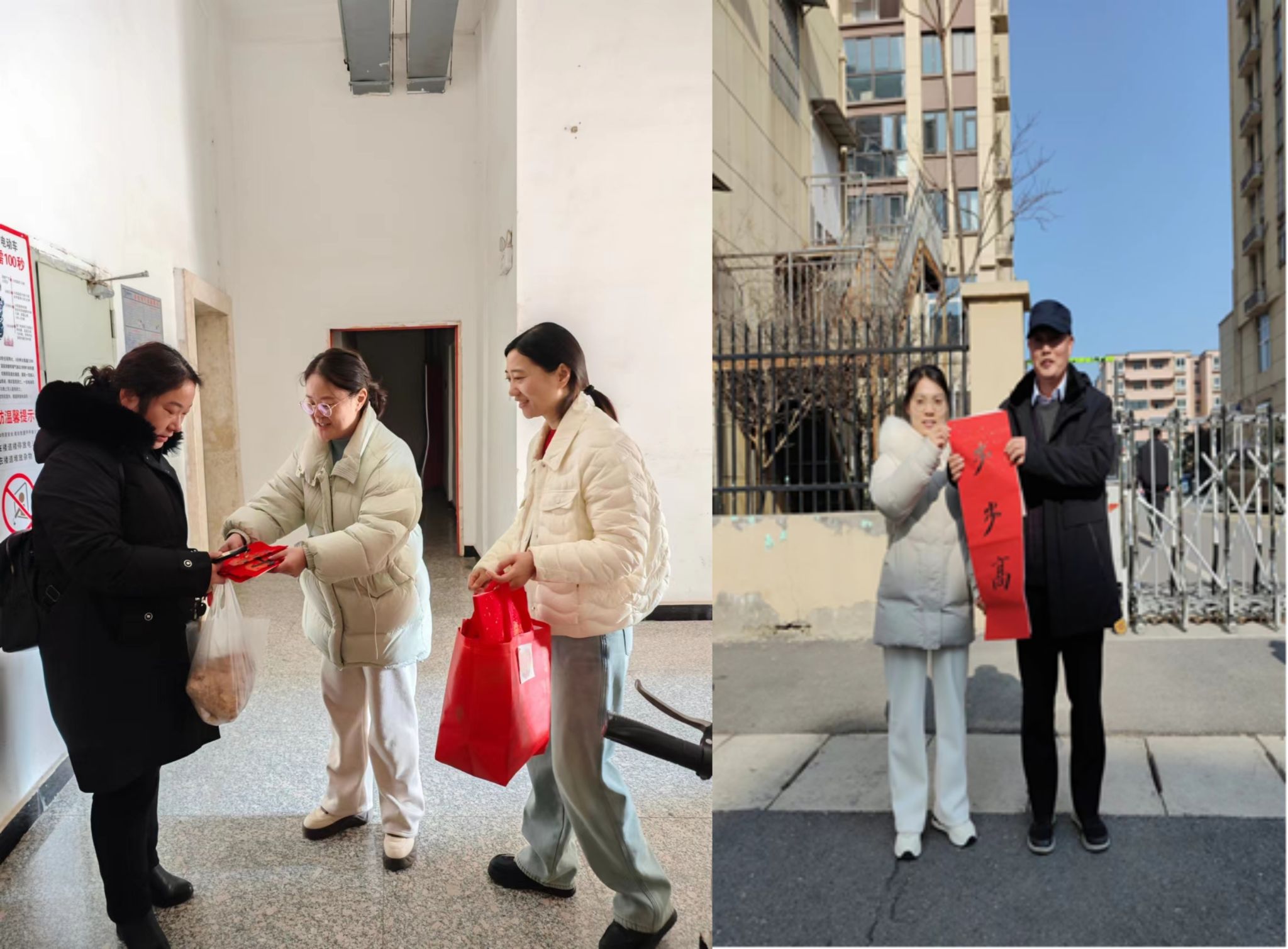 写春联、贴春联是过年的主要传统习俗,它象征着祥和、幸福,承载着人们对新一年的祝福和祈盼。在幼专雅居门口,党员们给社区居民送上了由学前教育学院的学生党员亲手书写的春联,“福满人间”、“吉祥如意”、“四季平安”、“五福临门”…… 一幅幅春联映红了笑脸,一个个“福”字温暖着人心,本次活动得到了前来领取春联的业主的高度评价,大家认为本次活动非常有意义,感受到了新年的氛围和学院师生的热情,并希望学院以后能多联合社区举办活动,实现院社共建。