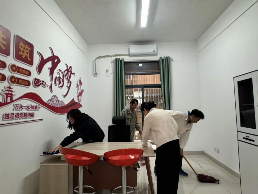 在支委杨梦洁的组织下,支部党员和入党积极分子们手持清洁工具,分工明确,认真清扫社区中值班室、心理访谈中心、党建领航站的每个角落。他们将桌椅摆放整齐,地面打扫干净,整个社区变得整洁而温馨。此次打扫活动,不仅改善了社区的卫生状况,更为同学们创造了一个更加舒适、宜人的学习和生活环境。