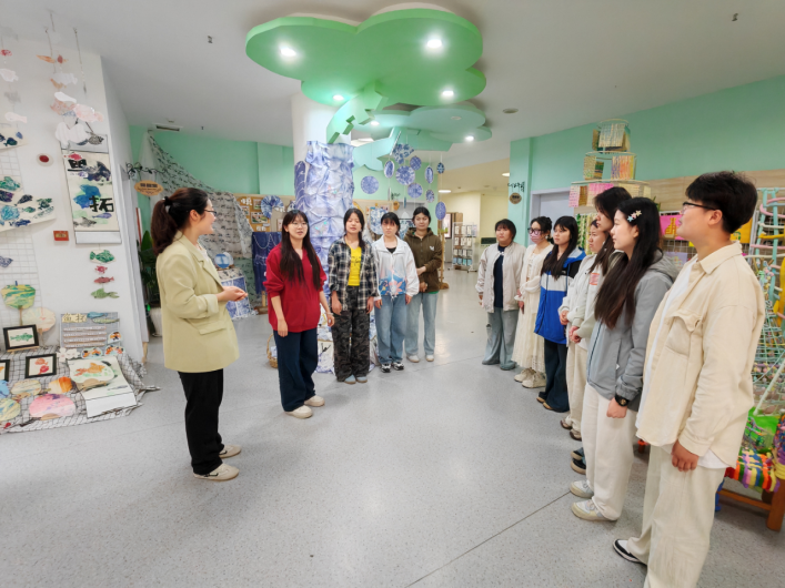 近日,阜阳幼儿师范高等专科学校学前教育学院与附属幼儿园携手开展了一场别开生面的教学实践活动。学前教育专业美术教师姜楠楠带领学生走出传统课堂,走进幼儿园非遗美术作品展现场,通过沉浸式教学,让学生近距离感受幼儿园真实教学情境,深入了解岗位需求,探索新型教学模式的无限可能。