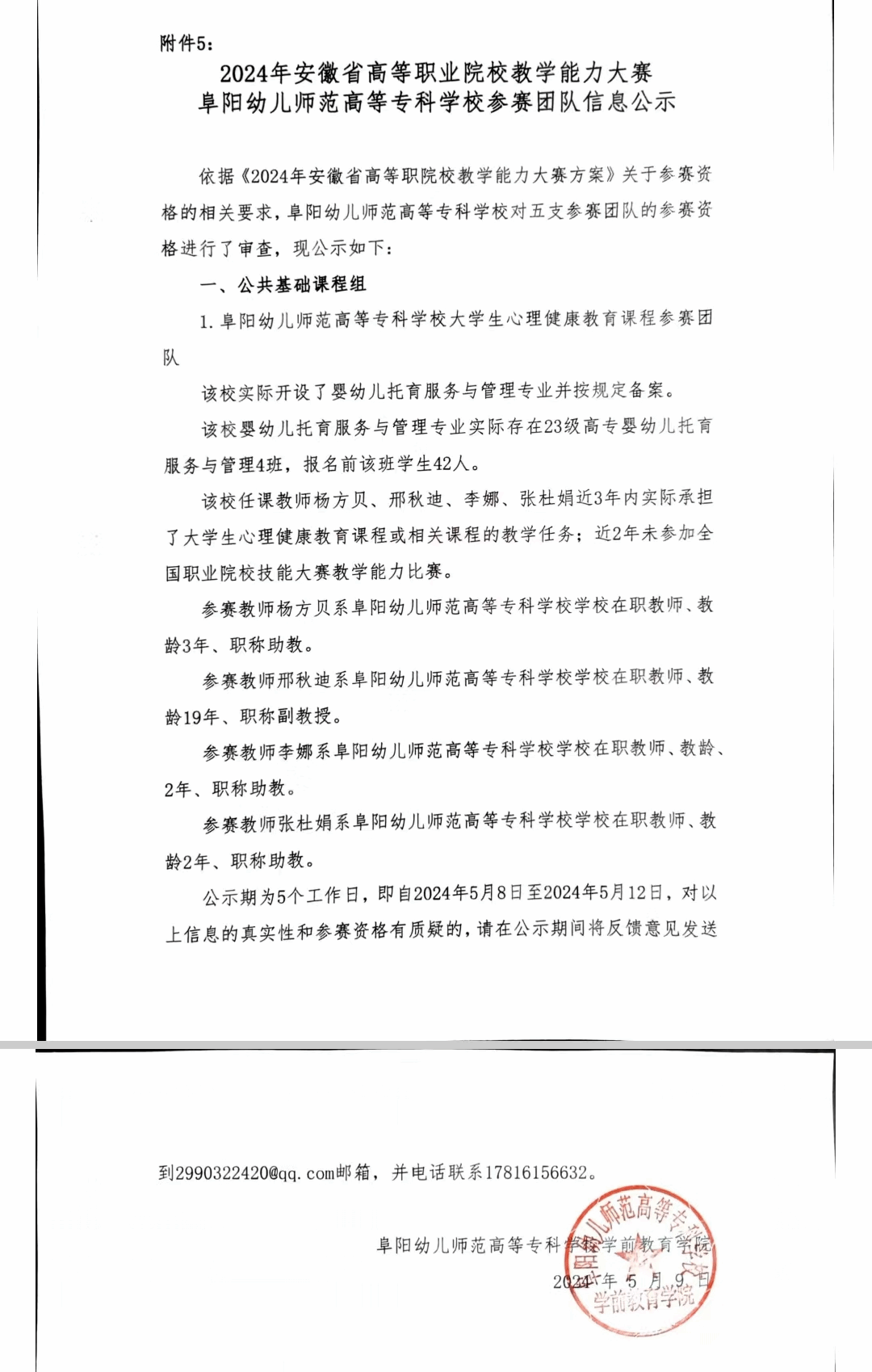依据《2024年安徽省高等职院校教学能力大赛方案》关于参赛资格的相关要求,阜阳幼儿师范高等专科学校对五支参赛团队的参赛资格进行了审查,现公示如下: