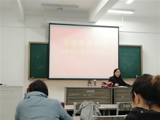 本网讯 12月5日下午2:30,学前教育学院教学工作会议在行知楼二楼北会议室召开,学前教育学院全体教师参加会议。会议由学前教育学院院长钱友莲主持,各教研室主任以及参加早期教育论坛、中国幼教年会等学前教育会议的教师作专题报告。