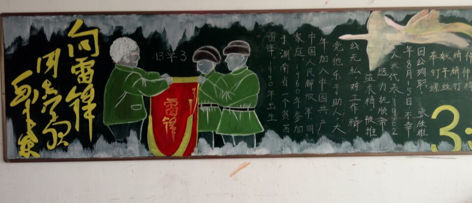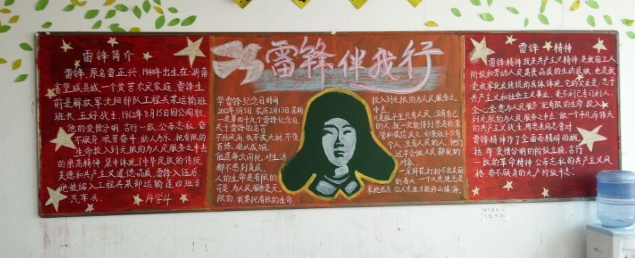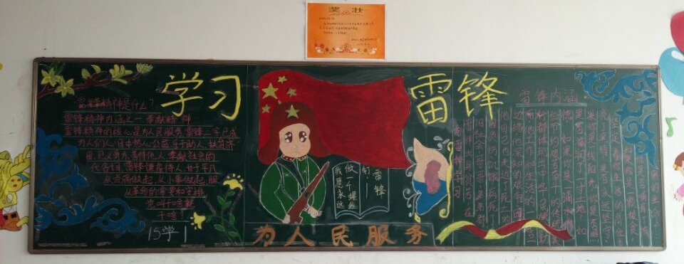 雷锋的故事有着鲜明的时代内涵和现实意义.他忠于共产主义事业,毫不利己专门利人,在各种不同的工作岗位上干一行爱一行,把有限的生命投入到无限的为人民服务之中去,在平凡的工作中为社会主义,共产主义的事业而奉献自己的力量.雷锋在实践中表现出来的全心全意为人民服务的共产主义精神,被誉为雷锋精神。为展现雷锋精神,在同学们心中树立雷锋形象,各班开展了丰富多彩的黑板报创作。