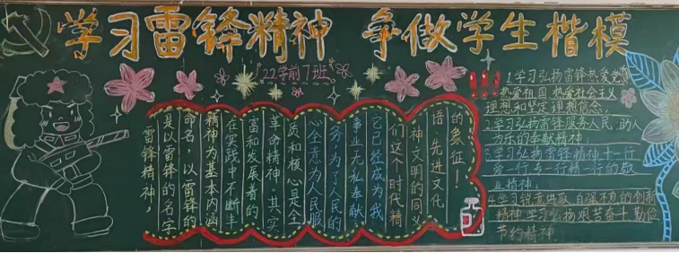 举办 “学雷锋”黑板报。为弘扬雷锋精神,彰显时代担当,学院开展了“学习雷锋精神,做新时代学生楷模”主题黑板报活动。各班级充分发挥学生的主动性、积极性,充分利用教室的后墙黑板,制作出了布局合理,融知识性、教育性于一体的黑板报。
