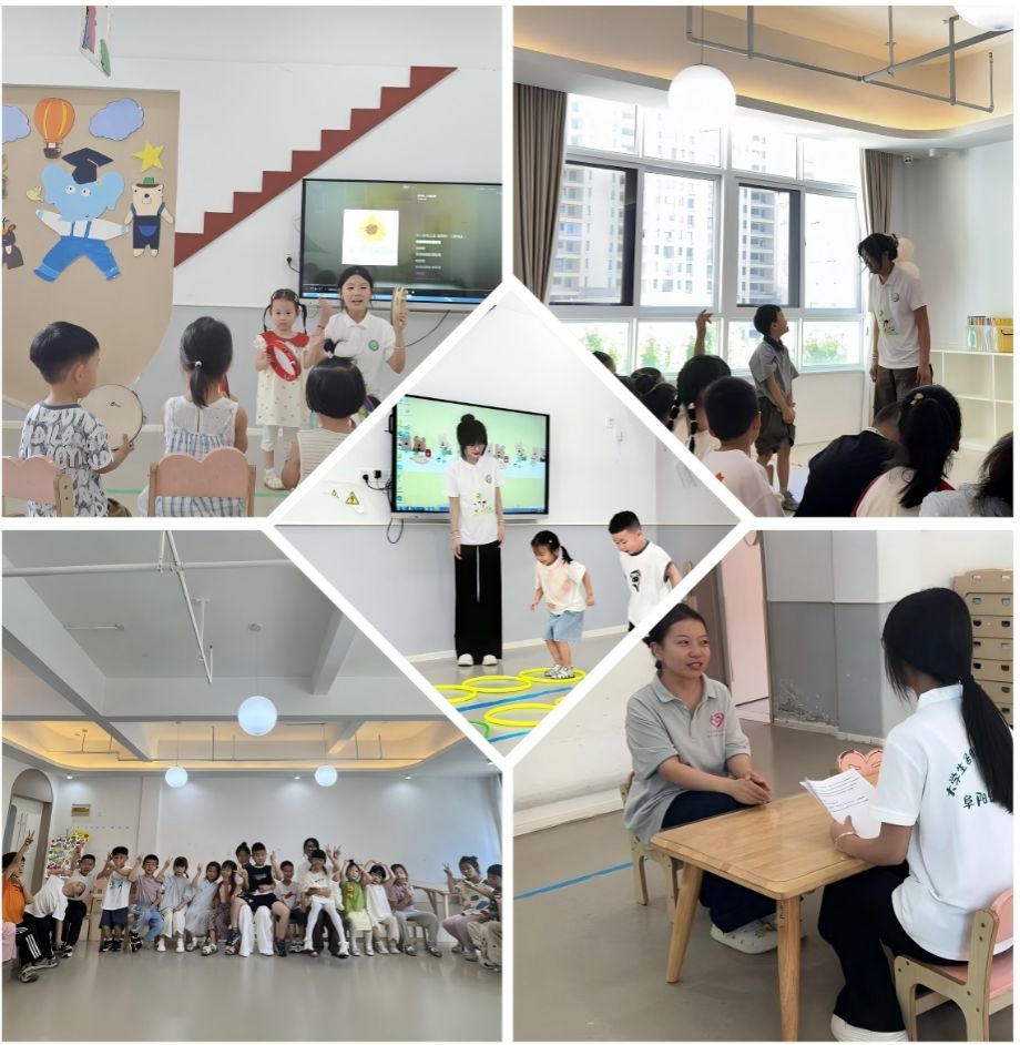 活动前期,团队与阜南县妇幼保健院托育中心积极对接,详细了解托育中心的日常运作、幼儿特点以及教学需求,精心筹备,为活动顺利开展筑牢根基。抵达托育中心后,团队成员们积极熟悉园所环境,主动观摩园所老师的一日工作,不断汲取经验,以便迅速投入实践。我们的活动分为三个篇章,分别是特色课程篇、发育评估篇、讲座调研篇。