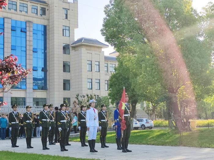 伴随着激昂的义勇军进行曲,国旗护卫队队员们迈着整齐的步伐护送国旗入场。在雄壮的国歌声中,在全体师生的注目下,五星红旗冉冉升起,在空中迎风飘扬。