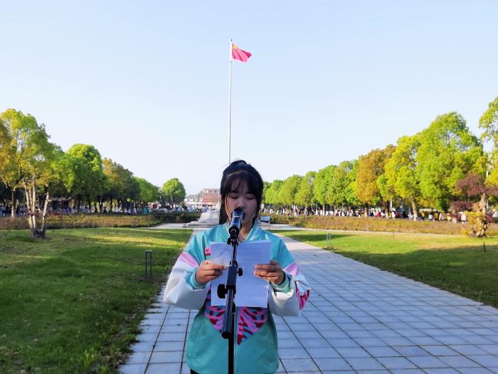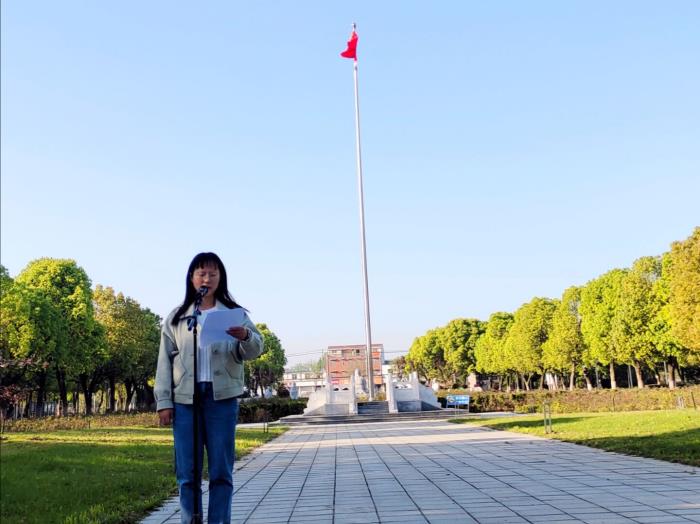升旗完毕,优秀学生代表江悦以“学党史,颂党恩”为主题进行国旗下演讲。号召青年学生应该把自己的人生理想与祖国、时代、人类命运联系起来,树立远大理想,培养良好品德,发扬创新精神,掌握实践能力,勤奋学习,立志成才。