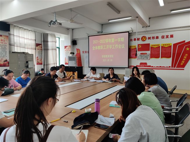 2021年9月9日上午,学前教育学院在行知楼413召开2021-2022第一学期全体教职工开学工作会议,会议由院长钱友莲主持,全体教师参加本次会议。