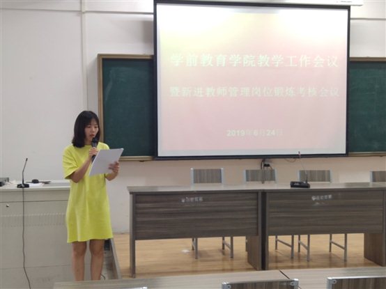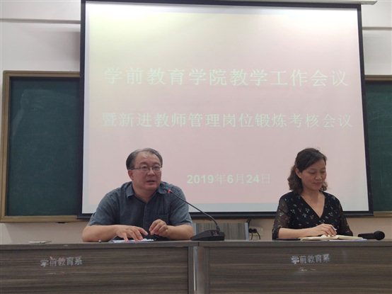 6月24日下午,学前教育学院教学工作会议暨新进教师管理岗位锻炼考核会议在行知楼二楼北会议室召开。校党委委员、副校长陈绪龙,学前教育学院院长钱友莲,各教研室主任以及学院全体教职工出席了会议。会议由钱友莲院长主持。