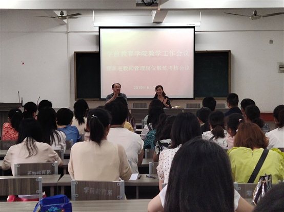 会议主要由三个部分组成,一是院长钱友莲宣读学校文件,二是对我院新进教师管理岗位锻炼的5位教师进行述职考核,三是院长钱友莲部署学期末教学工作安排。