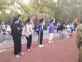 参加呼啦圈项目的同学们在比赛场地就位,比赛规则是所有参赛队员手拉手八个人站成一排, 由排头第一人手持呼啦圈,在保持每名队员不松手、呼啦圈不能接触地面的前提下,必须经过每一名队员使呼啦圈穿越整个队伍,用时短者获胜。在正式比赛开始前同学们按照身高顺序排成一列,并熟悉了几遍游戏的流程。