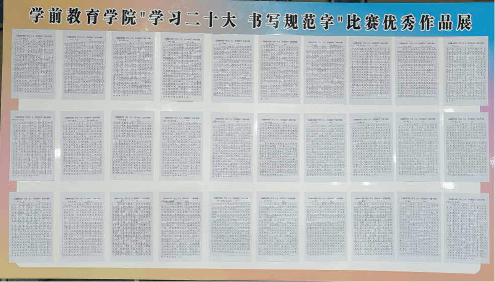 为深入学习宣传党的二十大精神,全面落实立德树人根本任务,进一步促进学生汉字书写规范化,近日,学前教育学院特举办“学习二十大 书写规范字”比赛并举办优秀作品展。