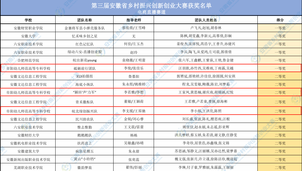 近日,我校学子在创新创业类比赛中再获佳绩,据安徽省乡村振兴创新创业大赛电商直播赛道获奖名单公示,我校首次选送3支团队参加省级决赛,斩获一等奖1项,二等奖2项,充分展示了学校在电商直播领域的培养能力和学生的创新创业实践能力。