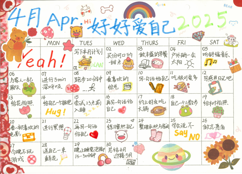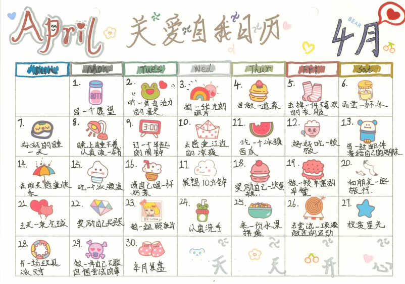 23级高专托育4班胡冰冰同学在完成自己的“自我关怀”日历后说道:“学校开展此次活动的形式很好,可以帮助我走出自我关怀的误区,找到爱自己的正确方式。”