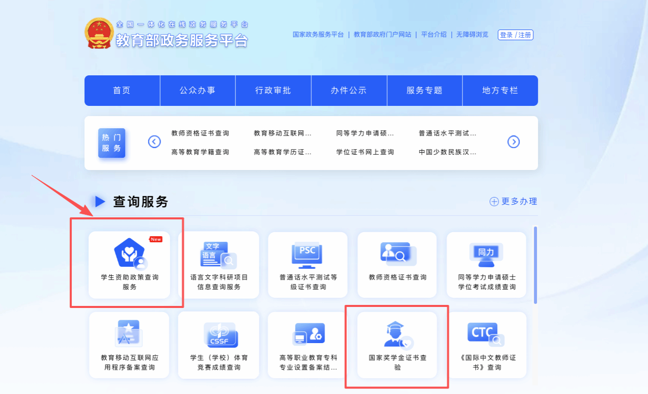 1.访问教育部政务服务平台(https://zwfw.moe.gov.cn/,即教育部官方网站服务板块),在“查询服务”板块,选择使用“学生资助政策查询服务”;