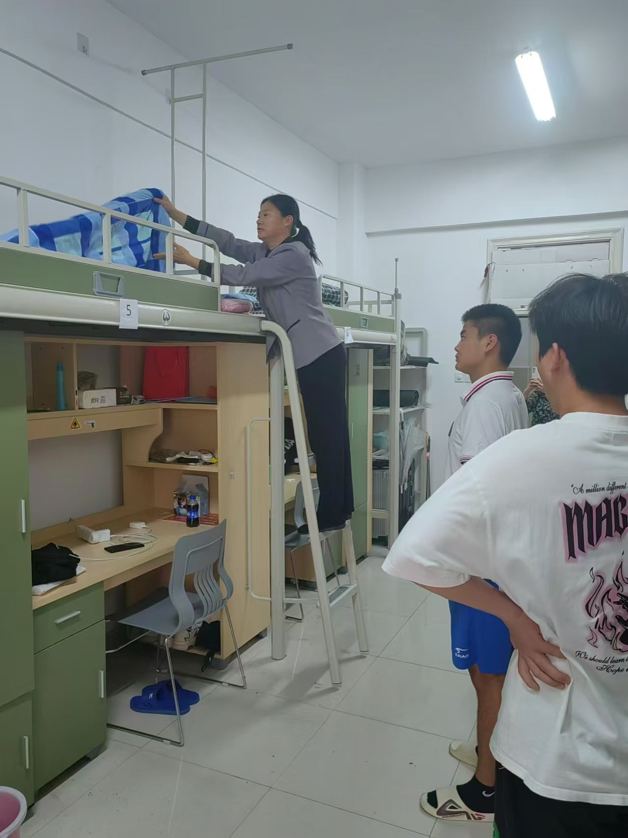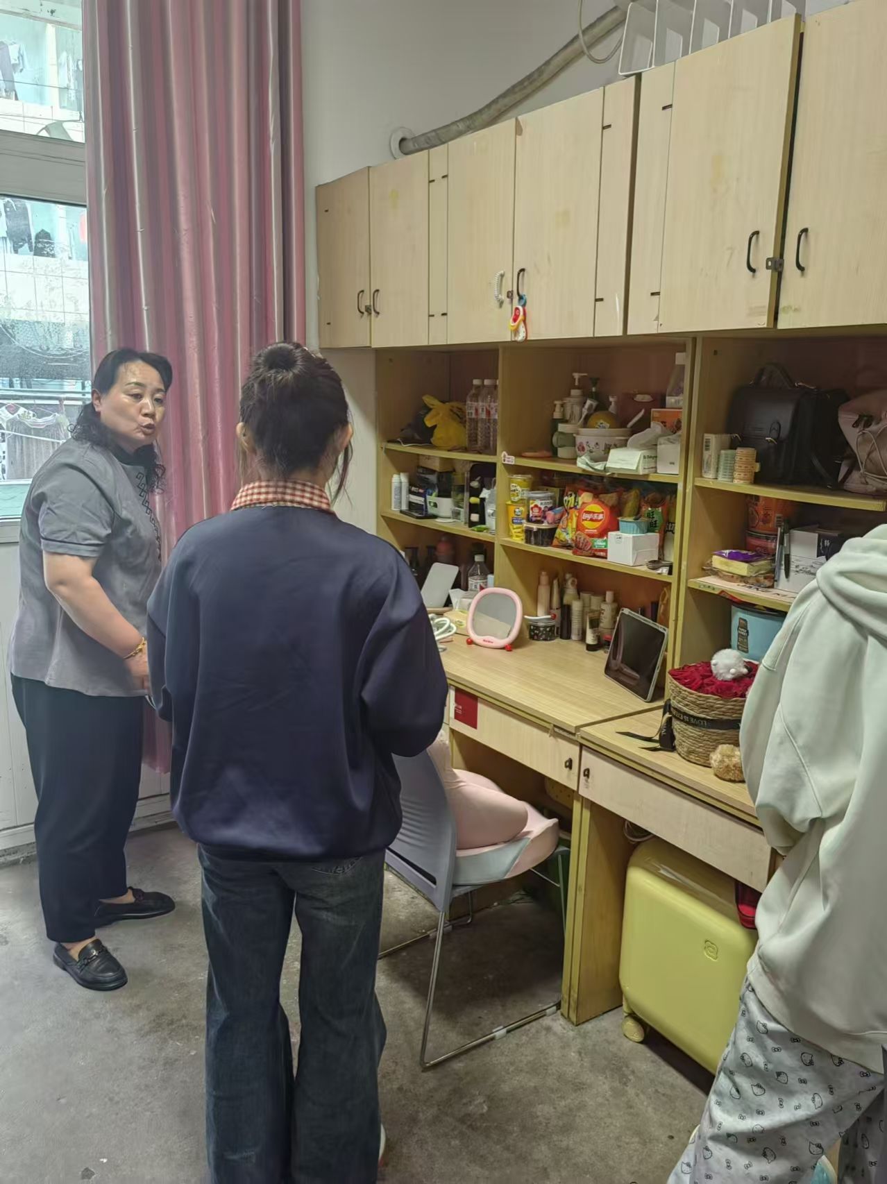 在学生社区公寓2号楼、8号楼,宿管阿姨深入学生宿舍,从地面、阳台、床铺、书桌卫生以及用电安全等方面指导学生进行内务整理,引导学生规整床铺下方、书桌角落、墙面装饰等,提高空间使用质效,促进布局整洁大方;督促学生对宿舍存在卫生、安全等问题立行立改,并现场耐心示范。同学们对宿管阿姨的帮助表现出极大的热情,积极进行内务整理,促使宿舍面貌焕然一新。