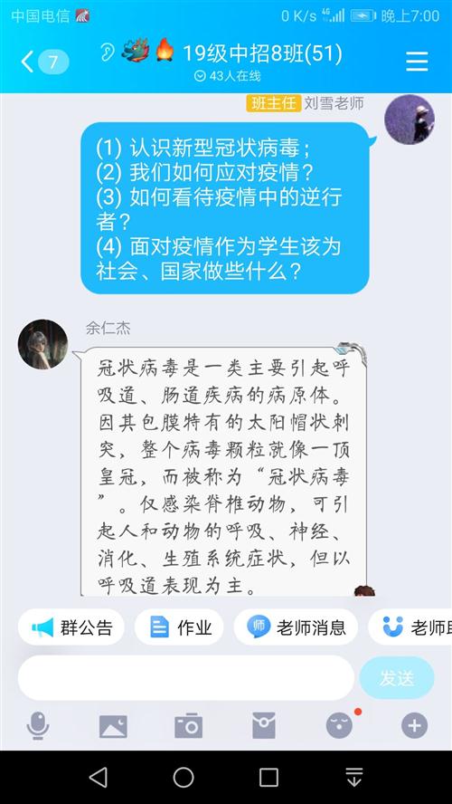 为深入贯彻落实习近平总书记关于打赢疫情防控阻击战重要指示精神,按照校党委关于疫情防控的战略部署,充分发挥网络育人、网络思想引领的功能,在学生处的统一安排下,我校班主任、辅导员纷纷把主题班会“搬”到网上,通过钉钉直播、微信群、QQ群等各类网络平台开展了网络主题班会。