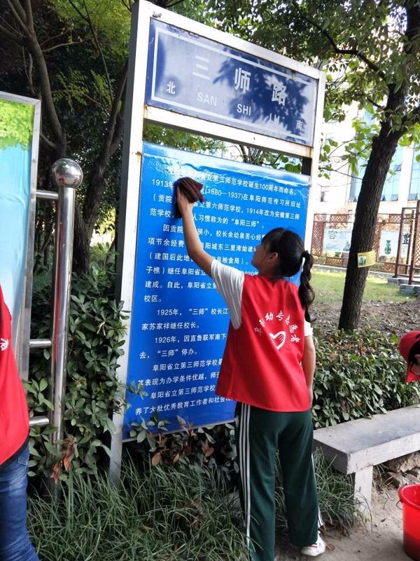 我们5点10在德馨楼门口集合。以围绕学校一圈的路线对学校沿途公示栏进行清理,他们七,八个人一组,有拿着桶提水的,有拿抹布的,还有拿小铲、垃圾袋的,可谓“全副武装”,工具齐全,俨然就像一支支清洁队,看上去十分专业,遇到张贴比较牢固的广告也能做到随心应手经过志愿者们一个多小时的辛勤付出,绝大部分广告被清除了,在我们面前的校园焕然一新,看起来十分干净清爽。