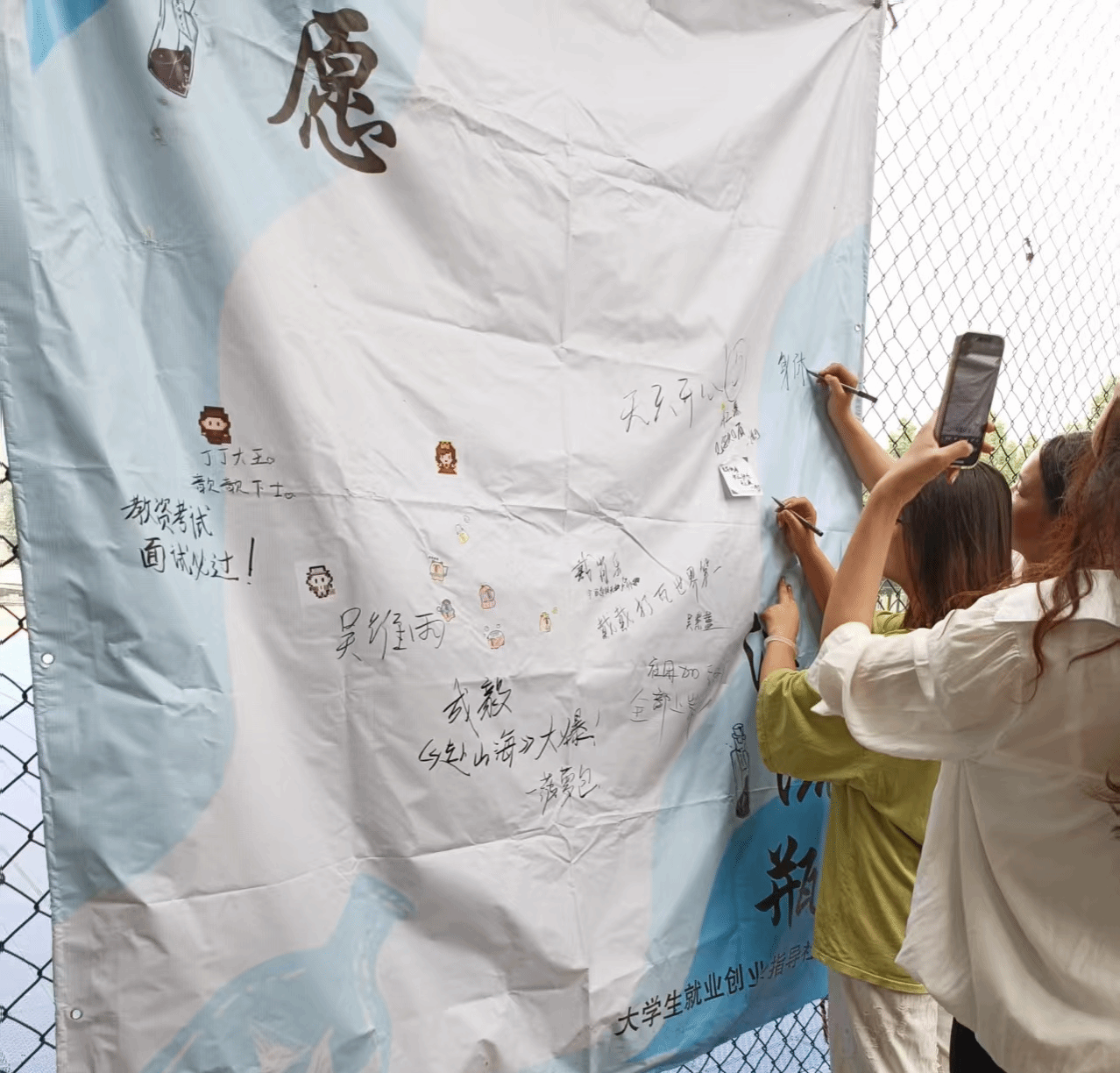 游戏区内欢声笑语,四大互动项目巧妙融合师范特色,引人入胜:"幼师特工"套圈挑战:参与者手持彩色圈,灵巧投掷,争夺小礼品,趣味盎然;"童心绘梦"心愿漂流瓶墙:蓝色展板上,学生们以贴纸、记号笔为笔,用心描绘"我心中的梦想",每一笔每一划都承载着对未来的美好愿景与殷切期望;"百发百中"知识问答:打气球游戏中暗藏智慧挑战,参与者需在击破气球前迅速回答一个古诗问题,答对者方能继续游戏之旅;"三局两胜"剪刀石头布擂台:工作人员变身"守关人",挑战者需连胜两局方能赢得精美小礼品,这场简易游戏不仅考验着未来幼师们的应变能力,更增添了无限乐趣。