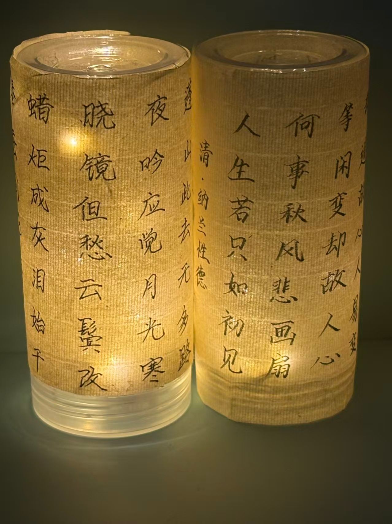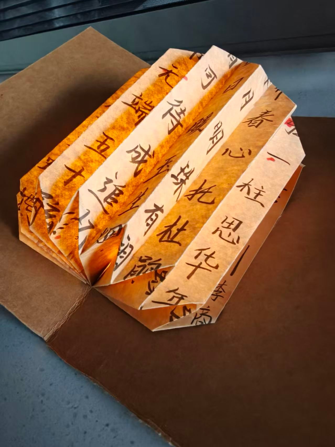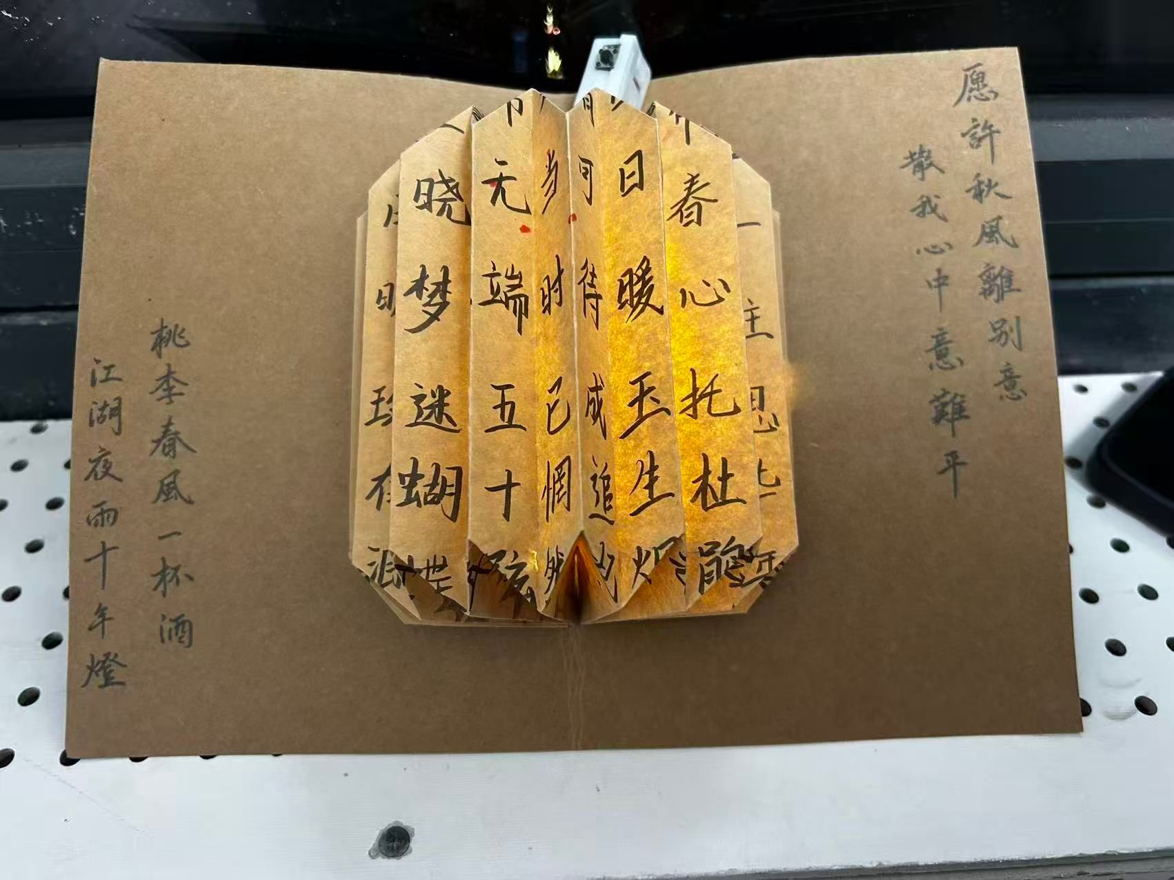 手工制作环节,同学们将写满诗词的纸张精心折叠、裁剪、拼接,与暖光灯具巧妙结合,亲手打造出兼具古典韵味与创意设计的立体书法灯作品。