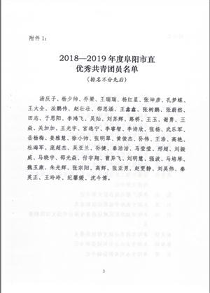 2018以来,市直各单位团组织和广大团员、团干部坚持以习近平新时代中国特色社会主义思想为指导,以学习宣传贯彻党的十九大精神和团的十八大精神为主线,深刻领会习近平总书记关于青年工作的重要思想,认真学习习近平总书记“7.2”重要讲话和在纪念五四运动100周年大会上的讲话精神,以共青团改革攻坚为目标,全面推进从严治团,紧紧围绕全市工作大局,积极投身脱贫攻坚战和抗击疫情阻击战,为服务我市经济社会发展做出了有力贡献,涌现出了一大批先进典型。为表彰先进,激励广大团员、团干部和基层团组织勤奋学习、积极实践、努力工作,共青团阜阳市直机关工作委员会决定表彰2018- 2019 年度“阜阳市直优秀共青团员”“阜阳市直优秀共青团干部”“阜阳市直五四红旗团委”。