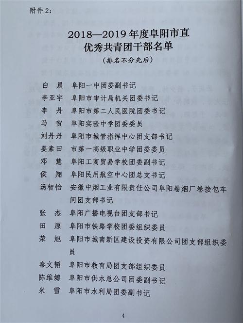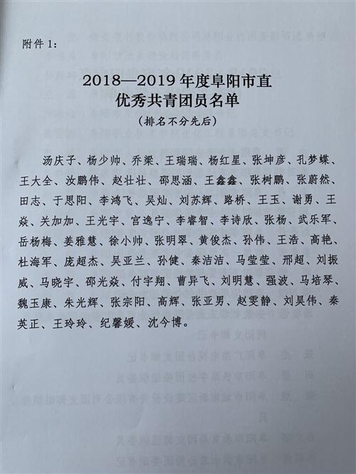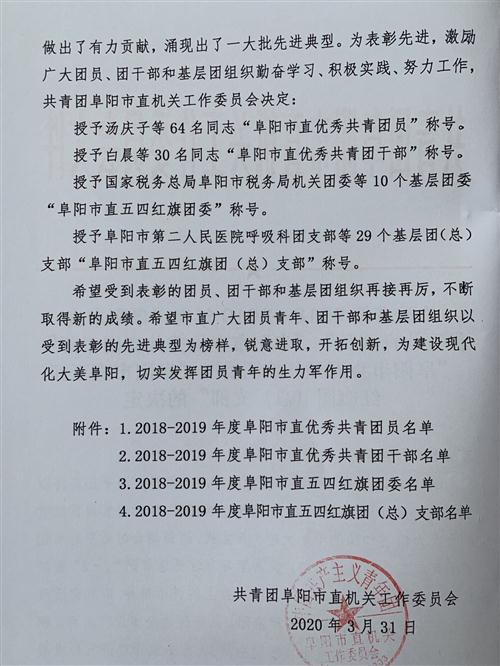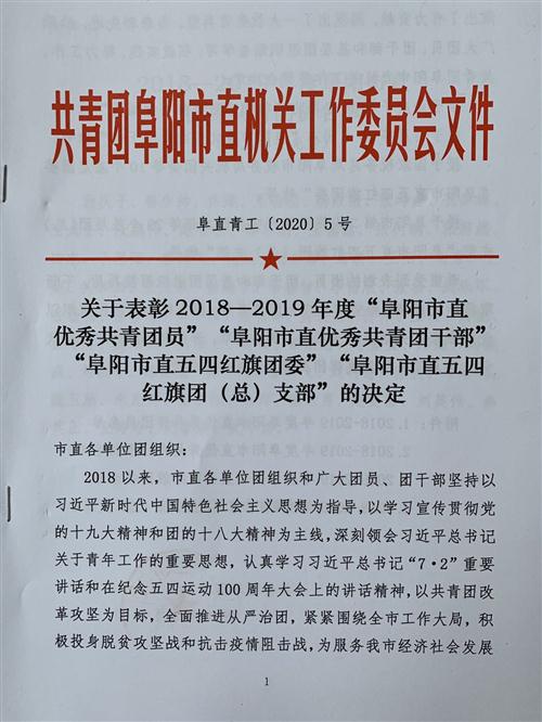 2018以来,市直各单位团组织和广大团员、团干部坚持以习近平新时代中国特色社会主义思想为指导,以学习宣传贯彻党的十九大精神和团的十八大精神为主线,深刻领会习近平总书记关于青年工作的重要思想,认真学习习近平总书记“7.2”重要讲话和在纪念五四运动100周年大会上的讲话精神,以共青团改革攻坚为目标,全面推进从严治团,紧紧围绕全市工作大局,积极投身脱贫攻坚战和抗击疫情阻击战,为服务我市经济社会发展做出了有力贡献,涌现出了一大批先进典型。为表彰先进,激励广大团员、团干部和基层团组织勤奋学习、积极实践、努力工作,共青团阜阳市直机关工作委员会决定表彰2018- 2019 年度“阜阳市直优秀共青团员”“阜阳市直优秀共青团干部”“阜阳市直五四红旗团委”。