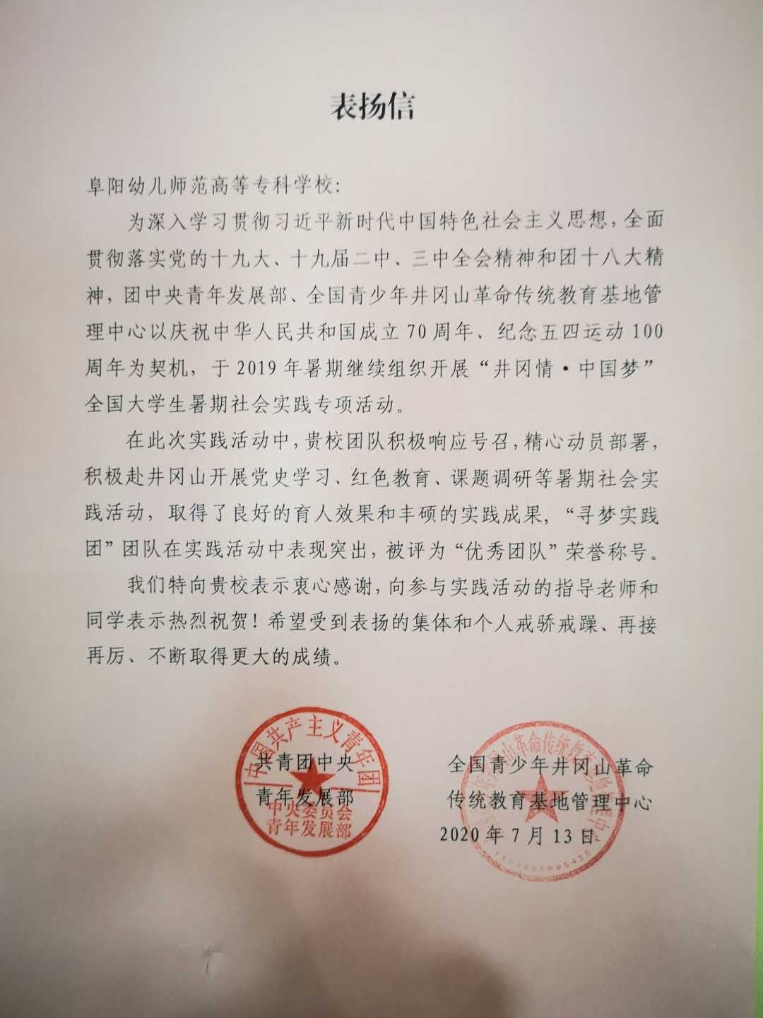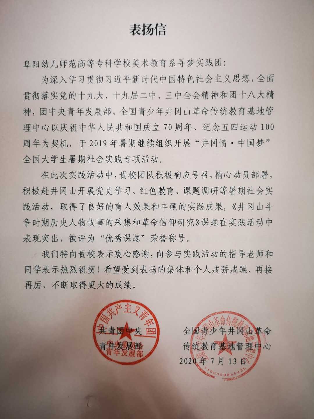 我校“阜阳幼儿师范高等专科学校美术教育系寻梦实践团”于2019年暑期参加“井冈情.中国梦”全国大学生暑期社会实践专项活动。活动中“寻梦实践团”团队在实践活动中表现突出,被评为“优秀团队”荣誉称号。研究课题——《井冈山斗争时期历史人物故事的采集和革命信仰研究》课题在实践活动中表现突出,被评为“优秀课题”荣誉称号。